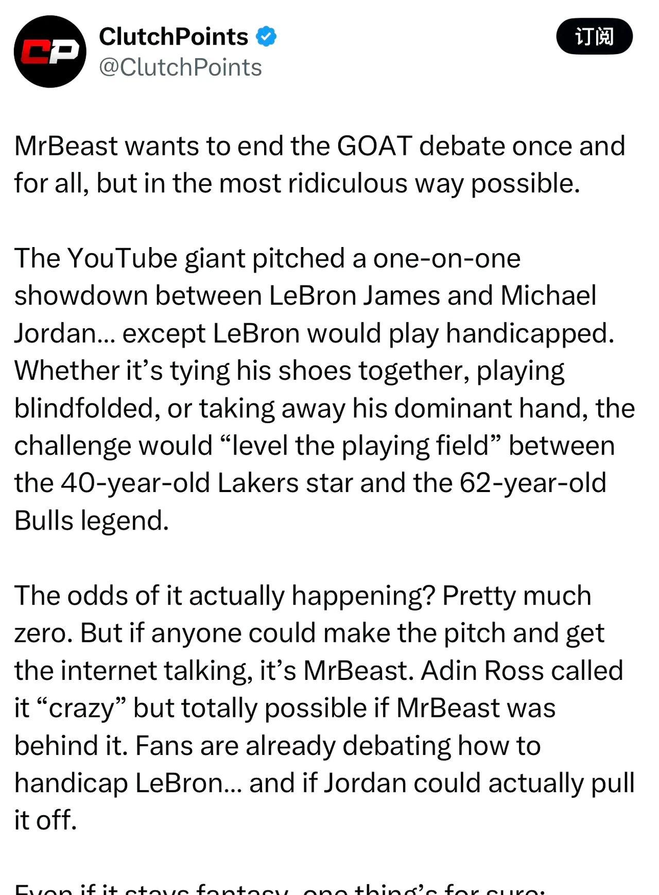 野兽先生(MrBeast)想彻底终结“史上最伟大球员”(GOAT)的争论,但他选