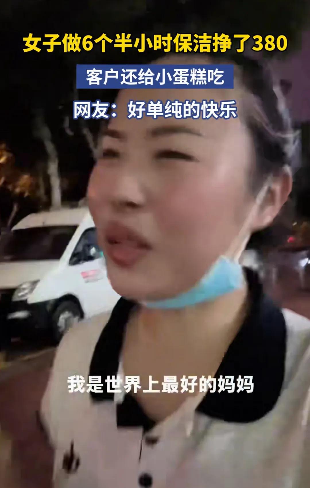 “今天净挣了380元,客户还给吃小蛋糕!”一位女子给客户上门做保洁整整六个半小时,刚刚结束一天劳动的她自豪的对着镜头说道。看着她满脸汗水的模样就知道她赚的是辛苦钱。她做这一行业很辛苦,但看得出她很感恩有现在这份工作。这位母亲边说边掏出雇主给她的腌鸡蛋和小面包,本以为她要犒劳自己。但她说这是留给自己的儿子郑小果的。她希望女儿收到糖果后说她是世界上最好的母亲。毫无疑问,这位母亲是幸福的,她挣的钱是辛苦钱,是干干净净的钱,她问心无愧。有人说一天380元看似很高,但一干就是六个多小时,折算下来并不算高,但她是三观很正的女子值得人们为她竖起大拇指。
