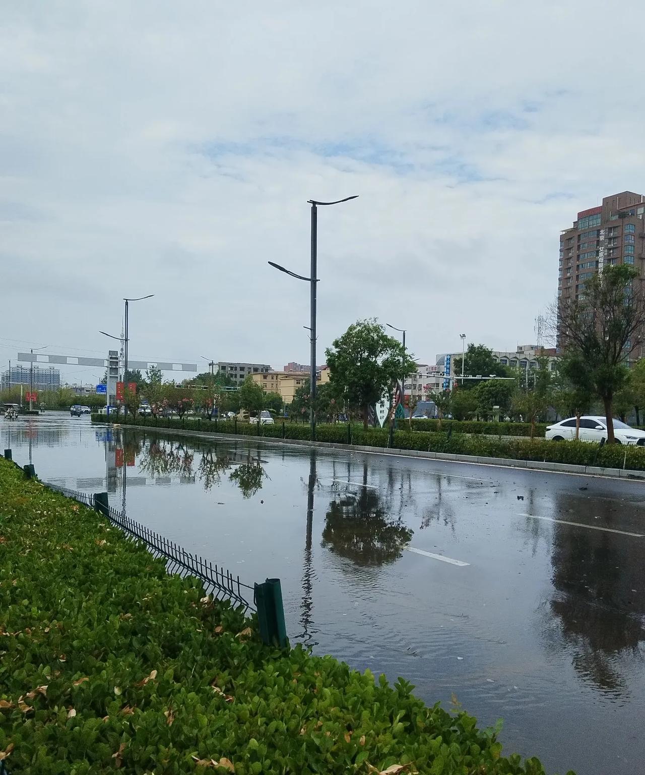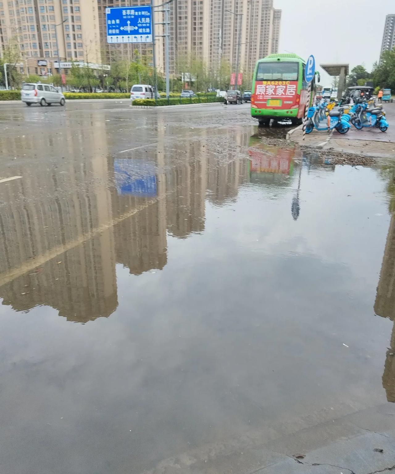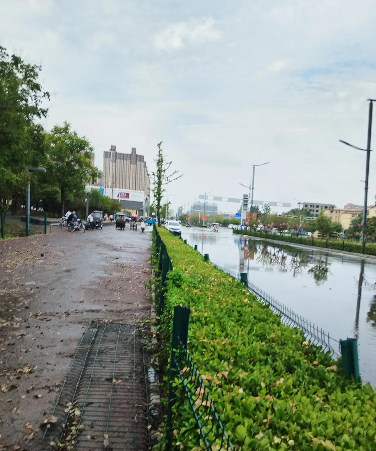 郑州昨天夜间下起了暴雨,部分街道积水,贾魯河水猛涨,天亮后,积水慢慢消退,河两岸