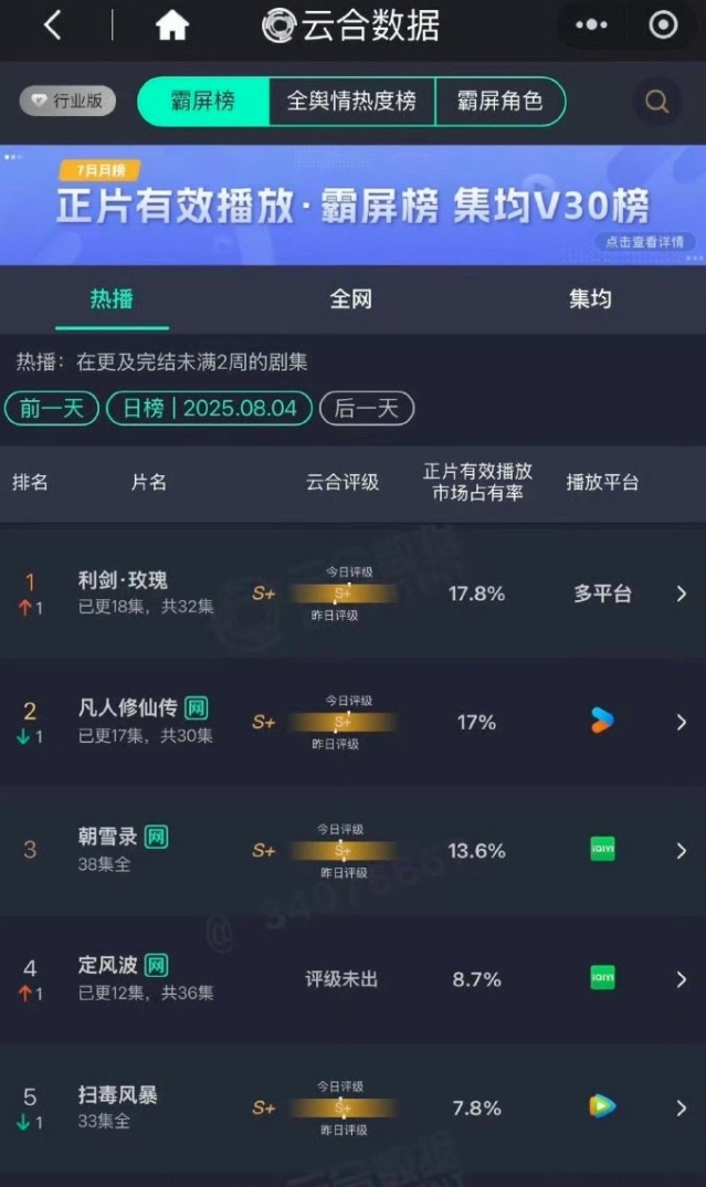 有说是凌晨涌入大量黑粉打了一星差评导致的,也有说是粉丝卖好评,涌入大量AI好评导致的,总之意义不大,不管是豆瓣评分,还是广告数量,还是其他一些辅助数据,只对爆剧来说有意义,如果剧没有爆,很多数据将没有任何意义,值得注意的是,《利剑玫瑰》已经超过《凡人修仙传》云合登顶了。