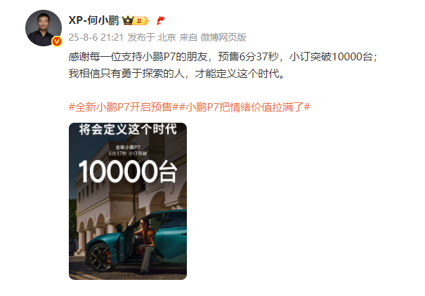 今天晚上,何小鹏连续发了四条信息,第一条是六分多钟就超过了,给大家报了一个阶段性的订单消息!