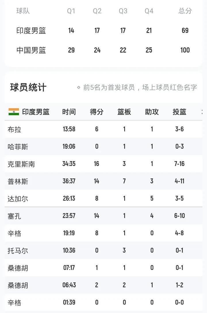 中国男篮100-69印度男篮 胡金秋11+10 廖三宁11+8 胡明轩17分 赵嘉义17分 王俊杰13分 程帅澎13分 赵睿6助