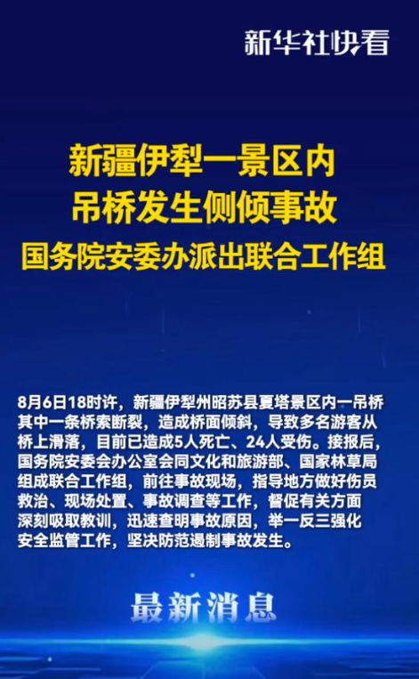 一场本该是“将军百战归来”的美好寓意,却在8月6日傍晚,化作了血淋淋的悲剧!新疆伊犁昭苏县夏塔景区的网红“将军桥”,一侧绳索突然断裂,导致29名游客瞬间坠落,最终造成5人死亡、24人受伤的惨剧。然而,这并非意外!多位亲历者和往日游客的爆料揭示:这座备受追捧的“网红桥”,安全隐患早已密布,而景区管理方却对这些致命信号视若无睹,最终酿成不可挽回的惨剧,这到底是天灾,还是人祸?!