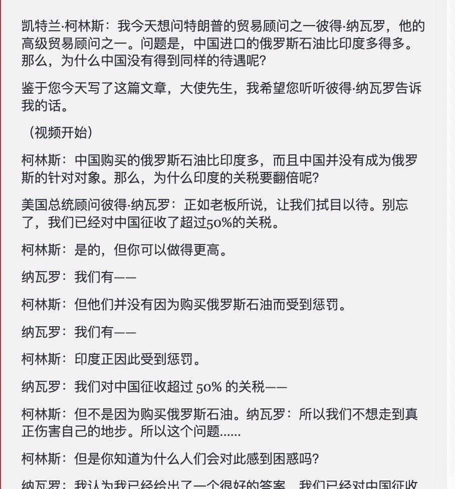 CNN记者凯特兰·柯林斯本周三在追问美国贸易部长彼得·纳瓦罗:为什么政府要对购买俄罗斯石油的印度征收双倍关税,而中国购买的石油比印度多,却没有受到惩罚。 而纳瓦罗一直在打太极,宣称“我们已经对中国征收了高额关税”。他根本就无法回答这个问题。也不敢承认,美国已经试过了,中国有稀土这张牌可以打,的确拿中国没办法。 而印度则不一样,没有牌可以对付美国。印度人买了太多俄罗斯的武器和石油,而不买美国的。特朗普一只嫉妒这件事。所以美国必须要在印度人身上啃下一大块肉。这才是美国人心里真正所想的。 现在,对特朗普来说,印度就是一只待宰的肥羊。对特朗普来说,他才不在乎印度过去替美国干了多少脏活呢?印度人很委屈,但没用。#面对美国加征关税印度有啥选择# #特朗普对印度加征关税会有哪些影响#