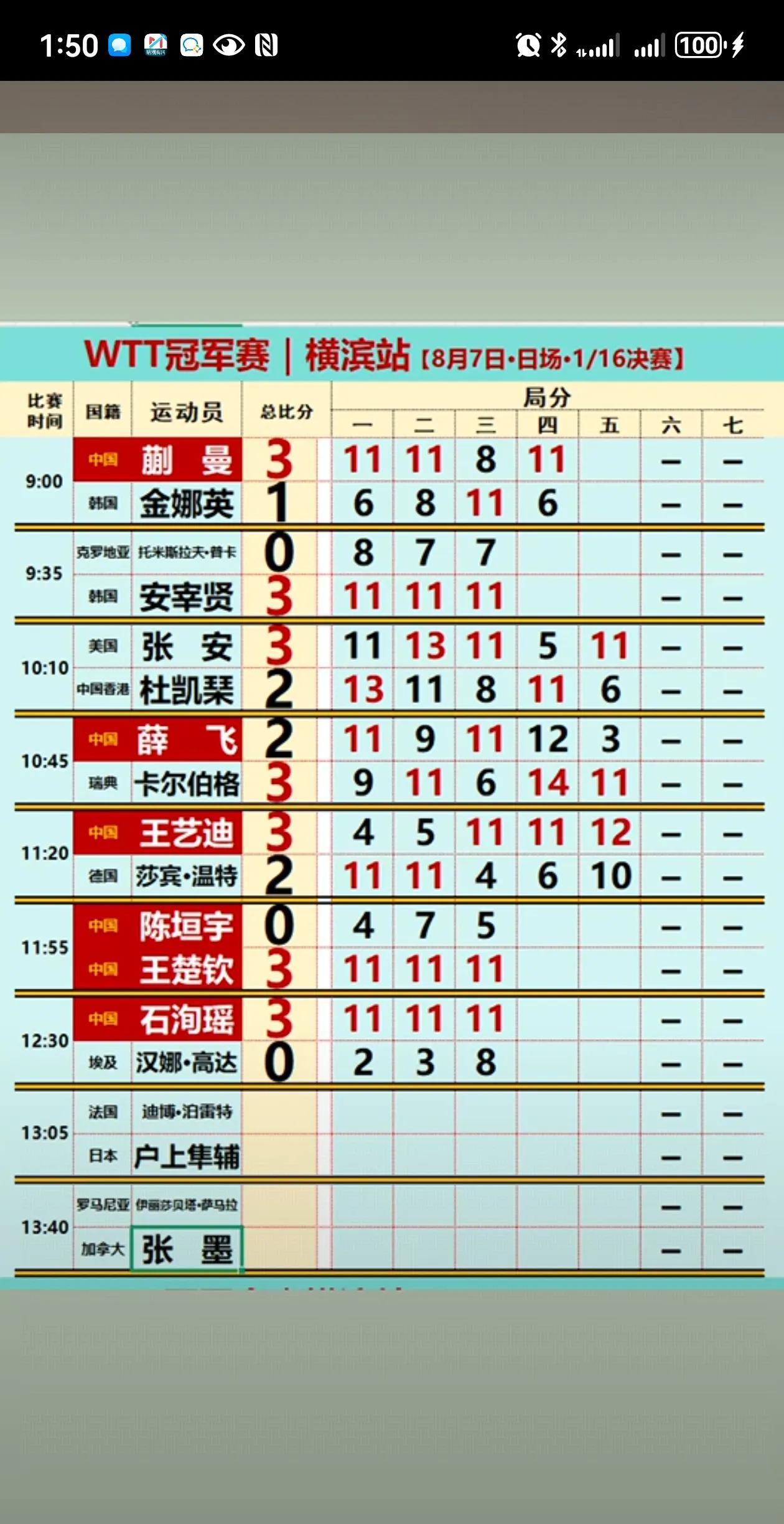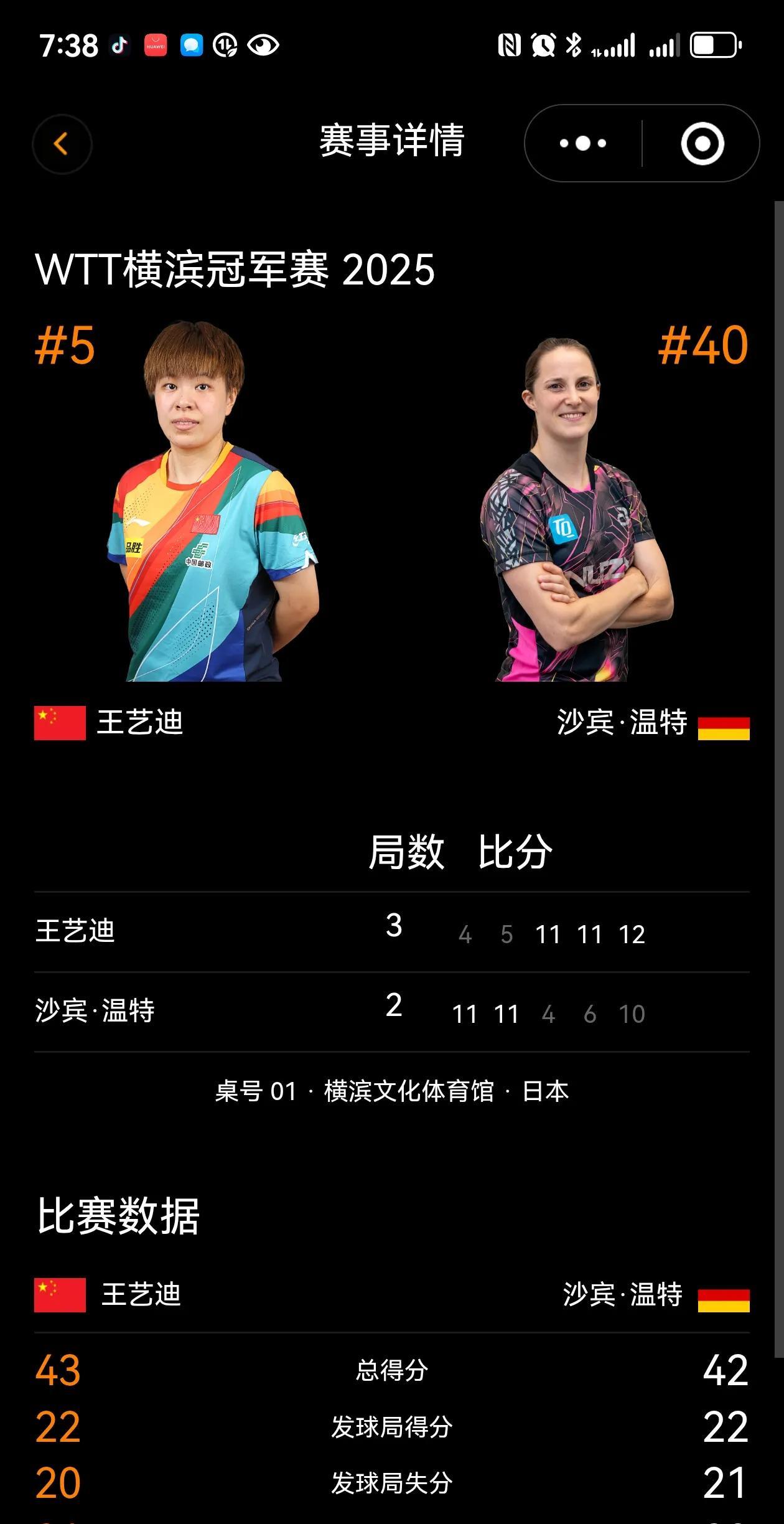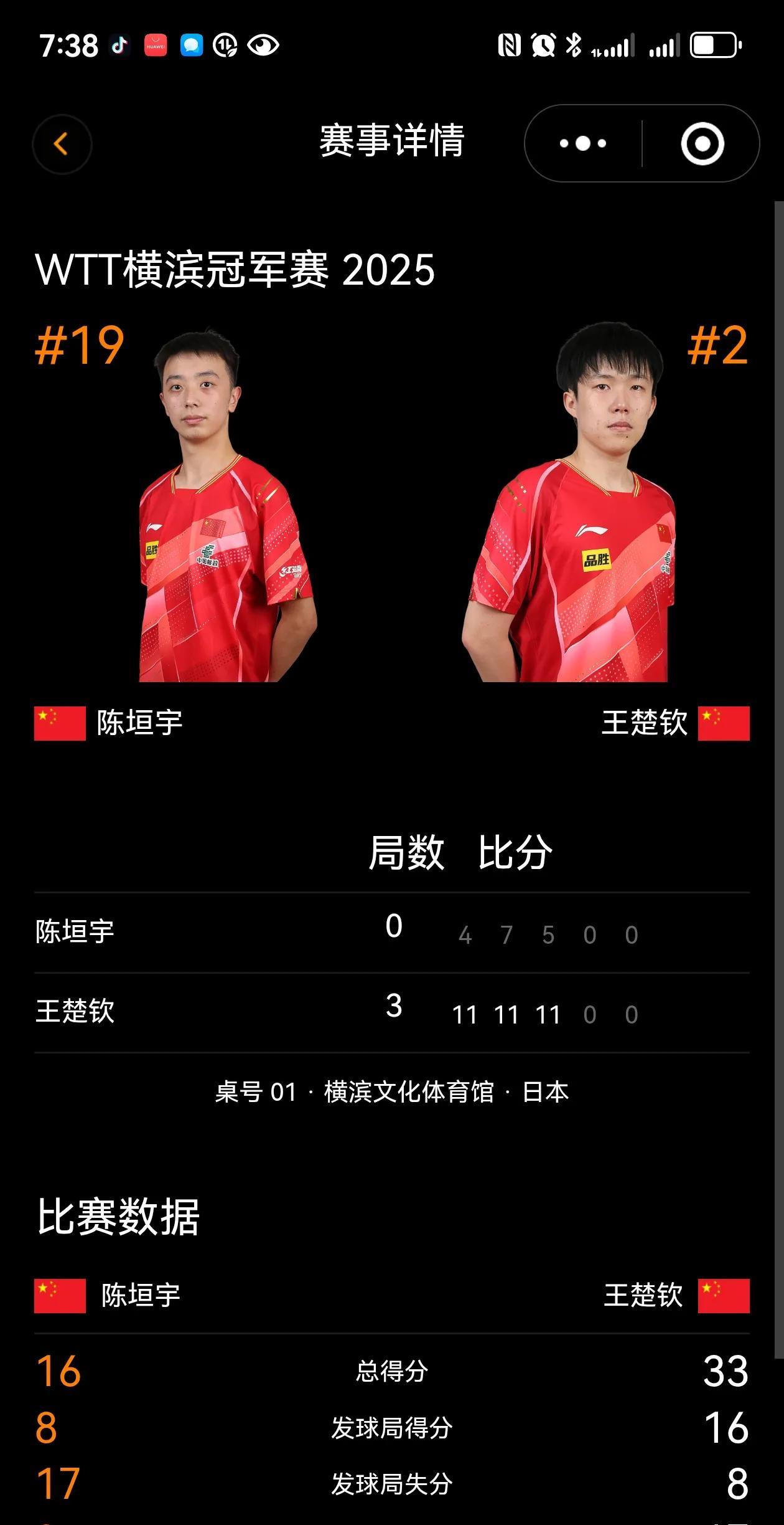 WTT横滨冠军赛2025:8.7-11,8.7首日比赛,开门红了,男单薛飞2:3惜败瑞典卡尔伯格,内战陈垣宇0:3不敌王楚钦,无缘16强。林诗栋3:1林昀儒,蒯曼3:1金娜英,王艺迪3:2大逆转法国温特,石洵瑶3:0高达,陈熠3:1帕瓦德,晋级16强。