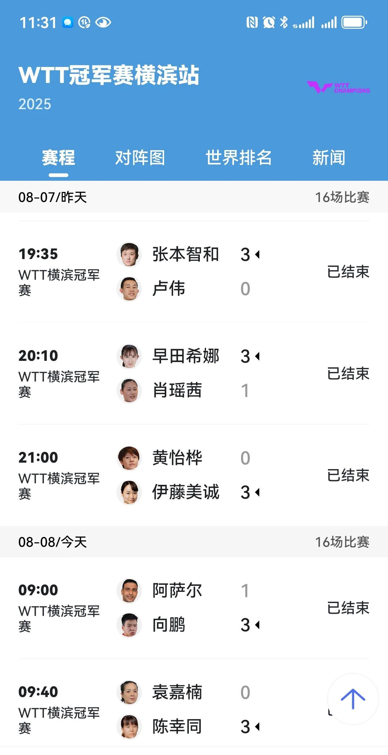 WTT横滨冠军赛2025:8.7-11,8.7首日比赛,开门红了,男单薛飞2:3