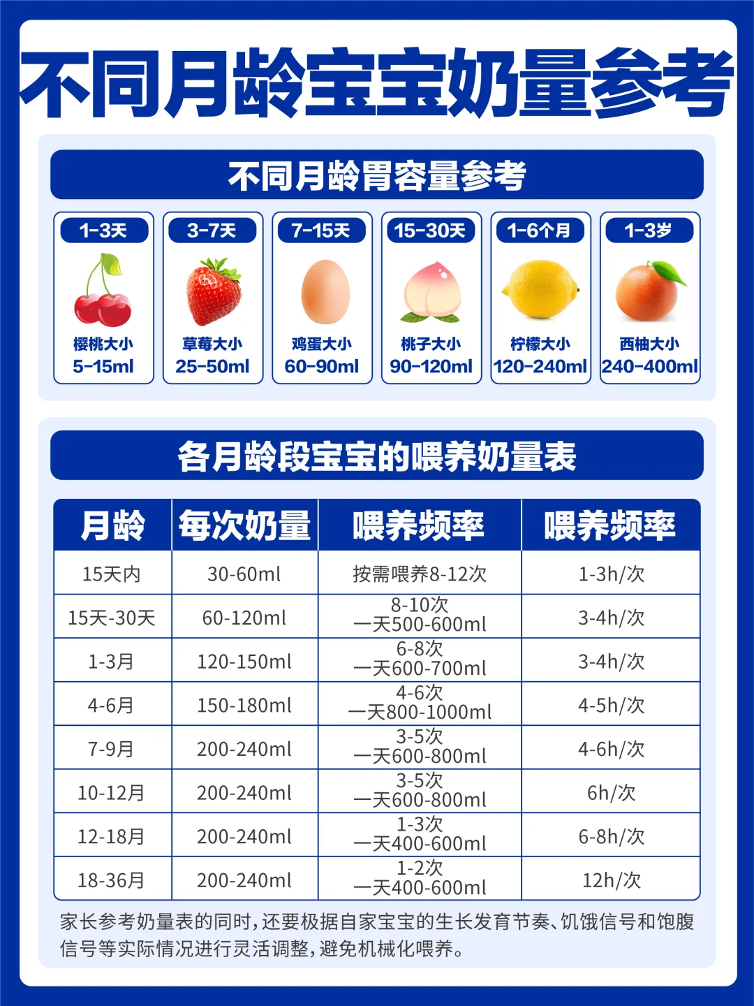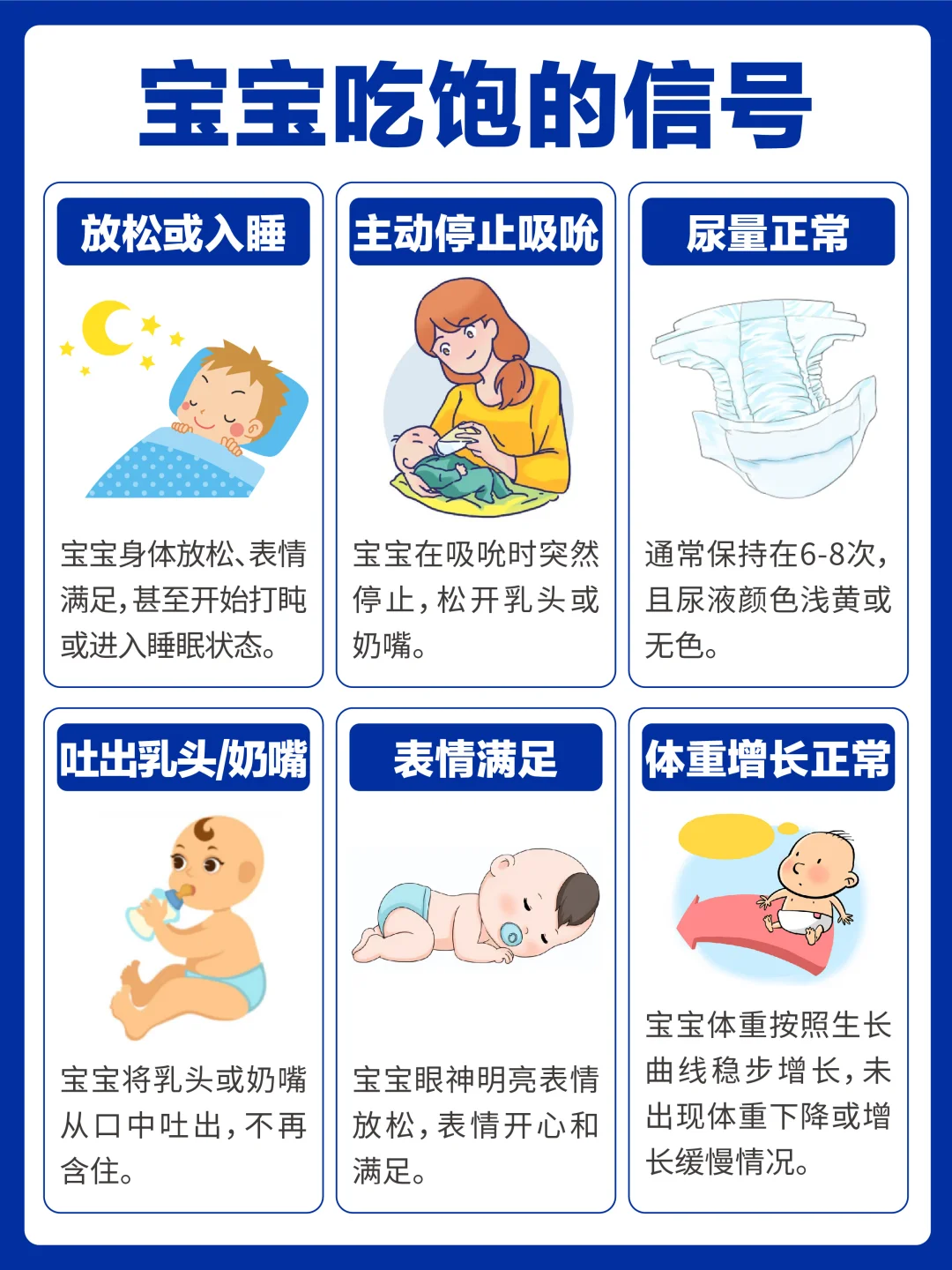 掌握了喂养节奏,奶量的把控也很重要,可以结合图4不同月龄宝宝的奶量参考和图5宝宝的吃饱信号进行灵活调整,图6的重点注意事项大家一定要记好。
