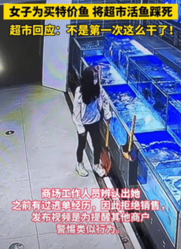 缺德缺冒烟了!广东佛山,一女子去超市买鱼,用渔网捞出来了两条大的,谁料,下一秒她就将鱼摔倒地上,接着就将鱼给踩死,而她这样做的原因,竟只是想买到“特价鱼”!事后,超市老板还指出,女子竟还是位惯犯! 据看余杭8月10日的报道,女子拿网兜把鱼捞出来后,就环顾了下四周,发现没有人注意她后,便把鱼摔倒地上,接着就狠狠的踩踏,直到鱼没有了动静后,才将其给放回到水缸里。 然而,在做完这一切后,又重新捞了一条大鱼,重复此前的操作,完事后她就叫来超市员工,表示这几条鱼都死了,能不能便宜卖掉。原来她之所以这样做,就是想要买到“特价鱼”, 可事实上,这种极其缺德的事情,女子也并非是第一次做了,超市老板就说了,之前她过来买东西时,就干出了逃单的事情。 而超市的员工对她都有点印象,所以在认出来她后,便直接表示鱼不能卖给她,随后女子就走了。 因为事情不是很大,外加超市老板也不想深究,这次就选择放过了女子,不过还是把监控拍到了给发到了网上,希望让附近的同行都有注意下。 其实像这种德行的人,千万不能够心软,必须要严惩他们,不然以后肯定还会出现那种情况的,要不然就在超市门口放个大屏幕,把这段监控录像循环播放,让大家都看一下她是个怎样的人。 那么对于这件事情,您有什么想说的呢?