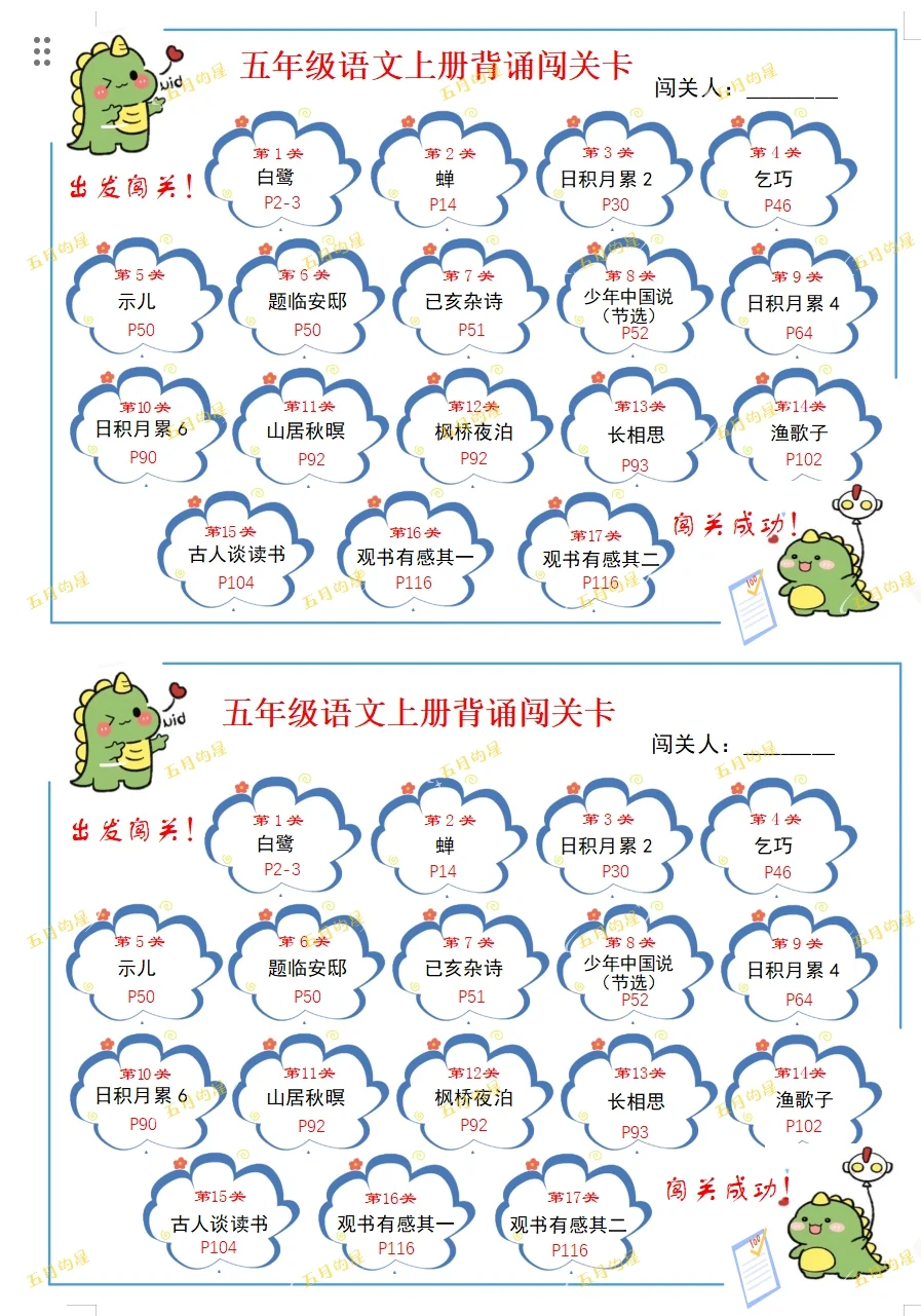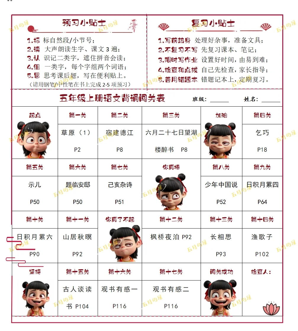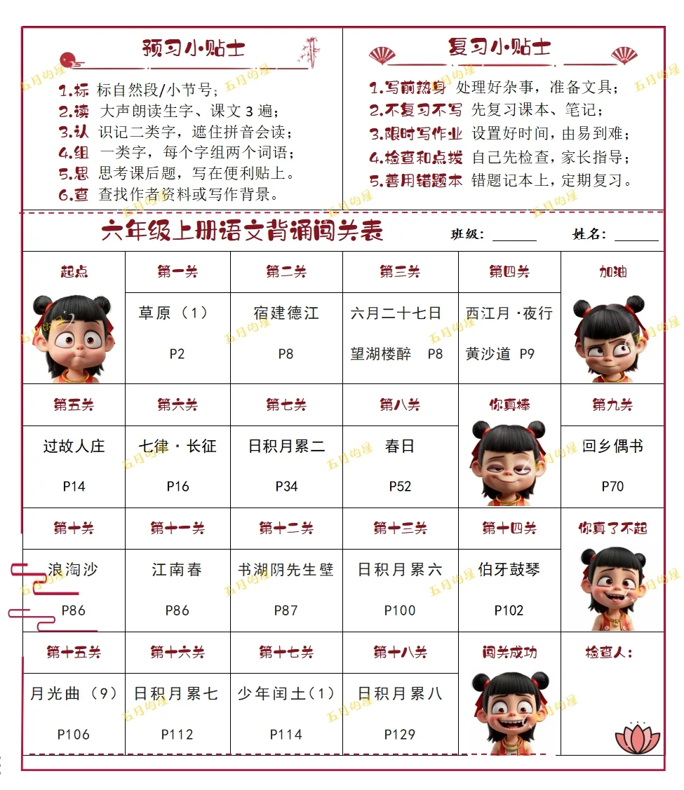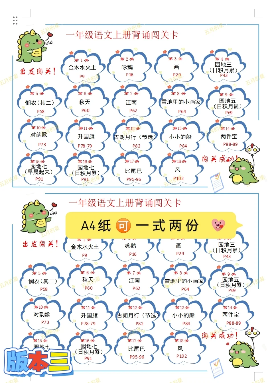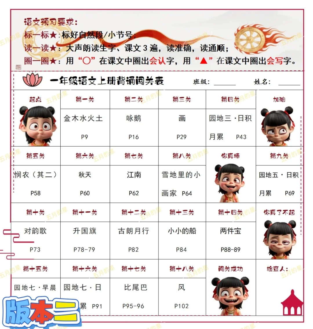2025秋小学语文新款背诵闯关表来啦[樱花R] 👏每个年级都做了三个版本,满足不同的需求: 版本1️⃣一式两份,方便班级打印; 版本2️⃣用了孩子们都喜欢的小哪吒,还针对每个年级特点,增加了预习要求; 版本3️⃣手可摘星辰,背完了可以涂上自己喜欢的颜色 🌻喜欢的宝直接拍👇链接,选择年级再下单,每个年级发3个版本(建议:手机上查看时有时显示不了格式,请电脑上下载)
