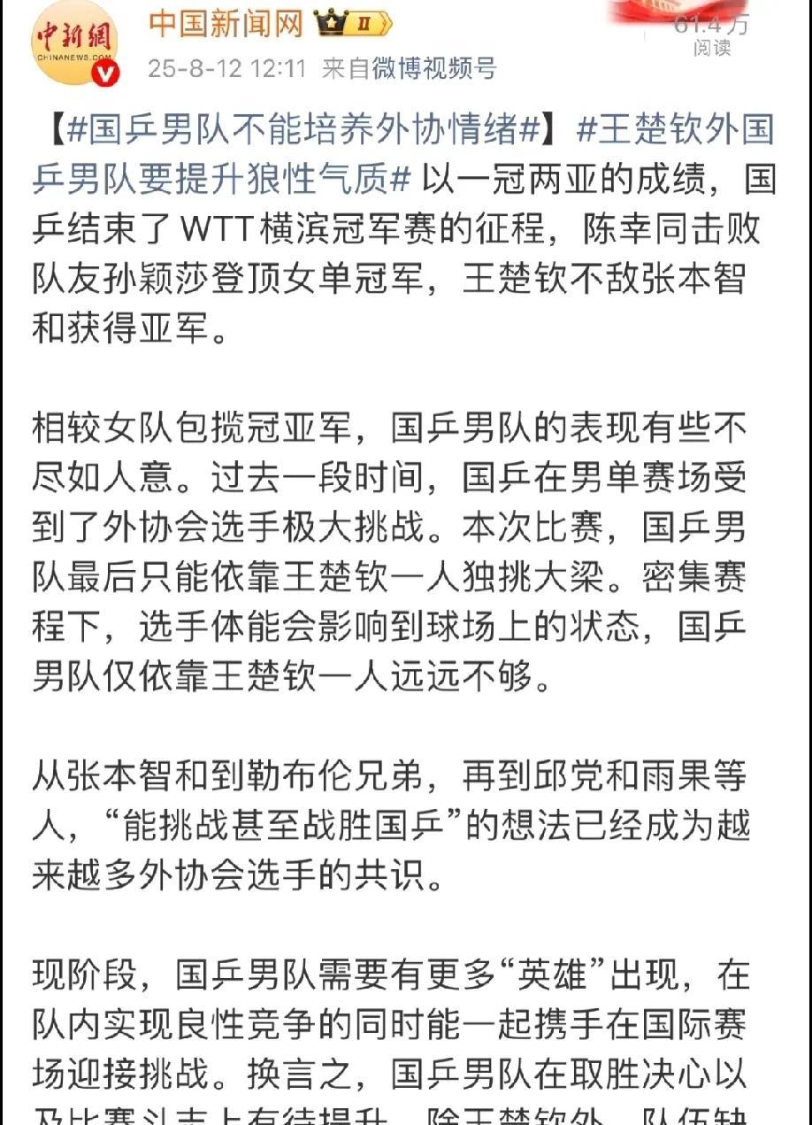 中新网这篇文章说得非常好! 不能让外协有能挑战甚至战胜国乒的想法,整个男线队伍,除了王楚钦,都缺少狼性! 之前解说Adam说他想不出还有谁比王楚钦的压力大,当时没人当回事,除了球迷,几乎没人帮他说话。最可恨的是,这么努力的运动员,在环境如此复杂的今天,仍然在赛场上拼尽全力为国争光,但输一次,就被怀揣各种想法的人口诛笔伐,连球迷的安慰鼓励都被说成饭圈,何其无奈。 虽然WTT是职业赛,输赢无伤大雅,但关键是赢一场,外协就会更有冲劲,更有信心,让他们觉得下次然可以战胜国乒。 一群外协如同豺狼虎豹,换着法的围剿一只狮子。任狮子再厉害,也不能每次都扛住群攻,次数多了总有失败。但如果是狮群,那就不一样,至少可以携手作战。 希望国乒的男子们,赶快站起来吧,携手共进,不求走到最后,只求能在比赛进程中可以帮着除去一两个对手。