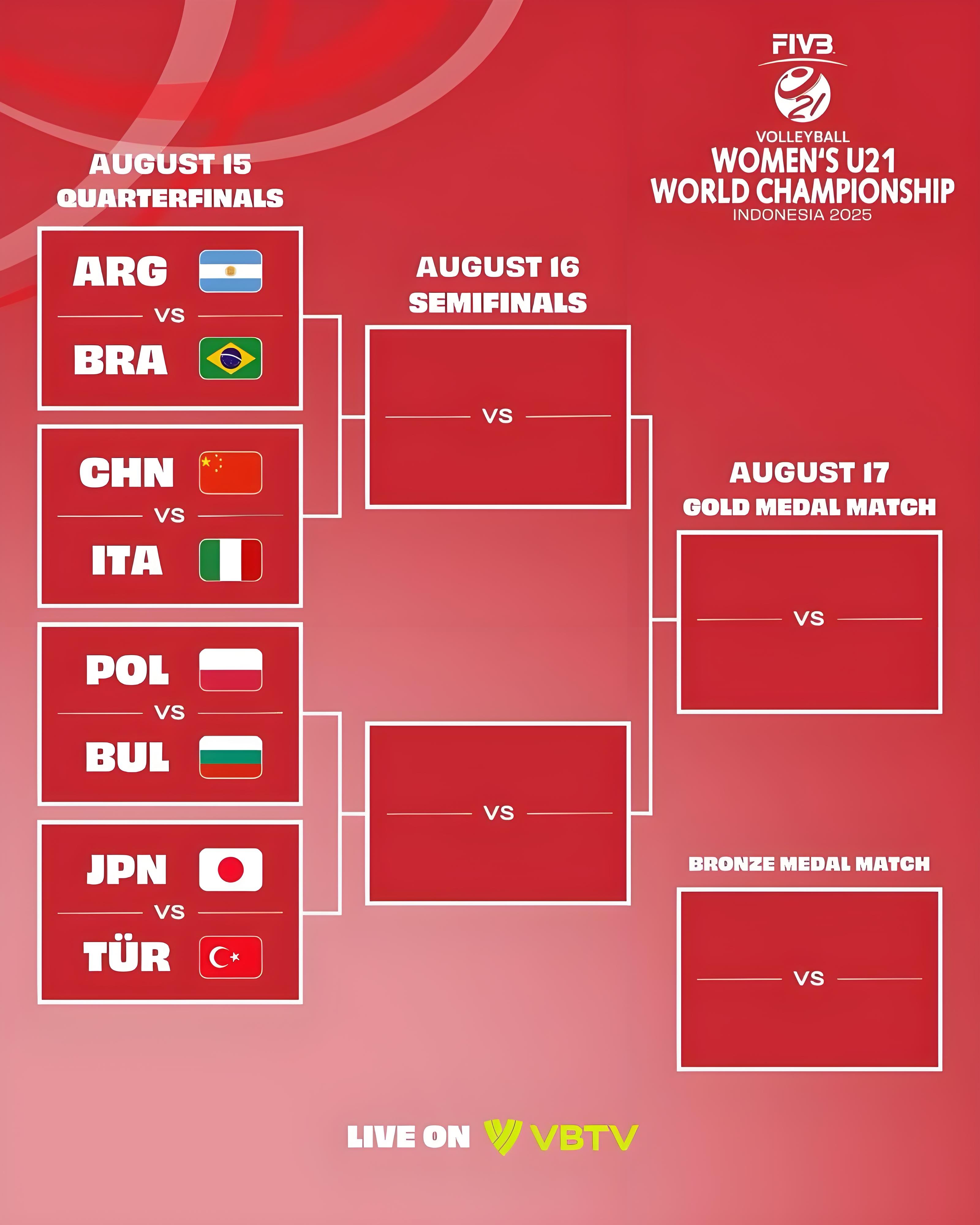 【赛事预告:U21女排世锦赛中国vs意大利】 印度尼西亚-泗水,U21女排世锦赛1/4决赛 中国女排将对阵意大利。 登上国际排联海报的是天津双姝。 二传朱航霆+自由人孙婉鋆。 两人师出同门感情格外好~ 比赛时间:8月15号 18:00。 观赛渠道:抖音-快手都可以搜到。 若是过关半决赛打巴西。 她们八进四3:0拿下了阿根廷。 三局比分为:25-19、25-18、25-14。 下半区两场1/4决赛对阵情况如下: 15:00 保加利亚vs波兰;21:00 土耳其vs日本