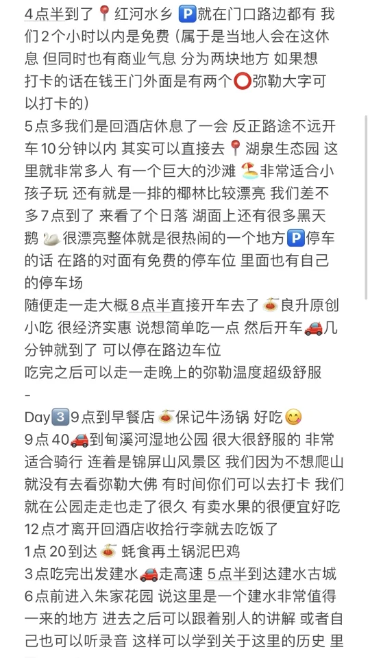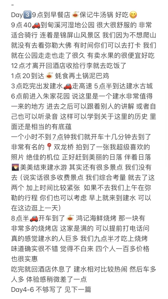 Day1⃣️ 🚄高铁长沙出发到昆明下午三点51到 提前联系好租车🚗在昆明南站交接 4点开车去吃第一顿饭🍝 5点半开车去📍昆明捞鱼河公园 将近8点日落才会结束 其实景点比较小时间很富裕 我们是7点半刚好最美的时候走了🚗酒店9点半到达 Day2⃣️9点半到早餐店🍝弥勒马氏卤鸡 10点出发去景点📍东风韵进入景区游玩逛逛拍拍3h 2点回到酒店稍微休息一下 就开车去吃饭了📍家的味道 4点半到了📍红河水乡 🅿️就在门口路边都有 我们2个小时以内是免费 钱王门外面是有两个⭕️弥勒大字可以打卡的 5点多可以直接去📍湖泉生态园 这里就非常多人 有一个巨大的沙滩 🏖️适合小孩子玩 还有就是一排的椰林比较漂亮 我们差不多7点到了 来看了个日落 湖面上还有很多黑天鹅 🦢很漂亮整体就是很热闹的一个地方 随便走一走大概8点半直接开车去了🍝良升原创小吃 很经济实惠 说想简单吃一点 然后开车🚗几分钟就到了 可以停在路边车位 吃完之后可以走一走晚上的弥勒温度超级舒服 Day3⃣️9点到早餐店🍝保记牛汤锅 好吃😋 9点40🚗到甸溪河湿地公园 很大很舒服的 非常适合骑行 连着是锦屏山风景区 我们因为不想爬山就没有去看弥勒大佛 有时间你们可以去打卡 我们就在公园走走也走了很久 有卖水果的很便宜好吃 12点才离开回酒店收拾行李就去吃饭了 1点20到达🍝 蚝食再土锅泥巴鸡 3点吃完出发建水🚗走高速 5点半到达建水古城 6点前进入朱家花园 说这里是一个建水非常值得一来的地方 进去之后可以跟着别人的讲解 或者自己也可以听录音 这样可以学到关于这里的历史 一个小时不到7点钟我们就开车十几分钟去到了非常有名的📍双龙桥 拍到了一张我超级喜欢的照片 绝佳的机位 正好赶到美丽的日落 伴着日落🌄结束建水游 8点半🚗开车到了🍝 鸿记海鲜烧烤 那一块有非常多的烧烤店 这家是满的 可以提前打电话问 真的感觉建水的人巨多 我们九点半才吃上烧烤 味道确实很不错 觉得不白来 四个人一百多价格也很实惠 建水相对比较热闹 车多人多 体验感稍微差了一点 Day4-6 不够写了 见下一篇(详细版的我放最后啦)❤️