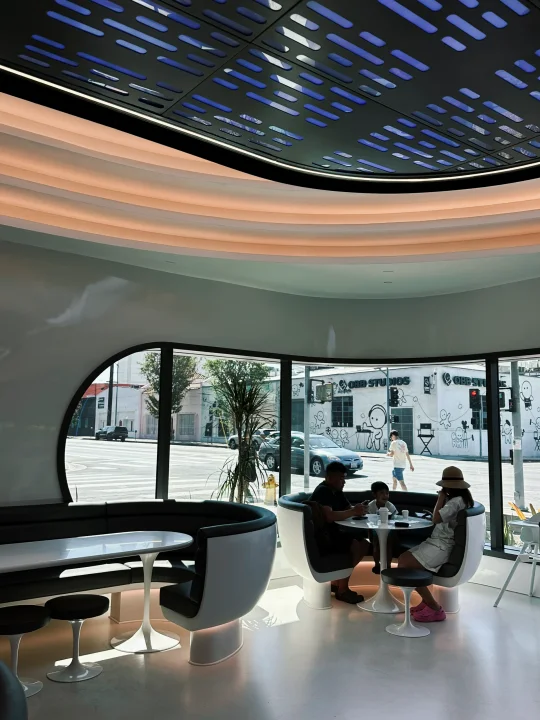本特斯拉车主 下飞机☝🏻站打卡朝圣! 10点就到达,就在门口旁边就找到街泊 人不多~ 基本上到门口直接进去~ 10分钟不用就逛完…二楼是要到11点才开放的,去早了所以没得上去.. 虽然不好吃,但拍照非常有未来感!! 🚘Tesla Diner 7001 Santa Monica Blvd, Los Angeles, CA 90038