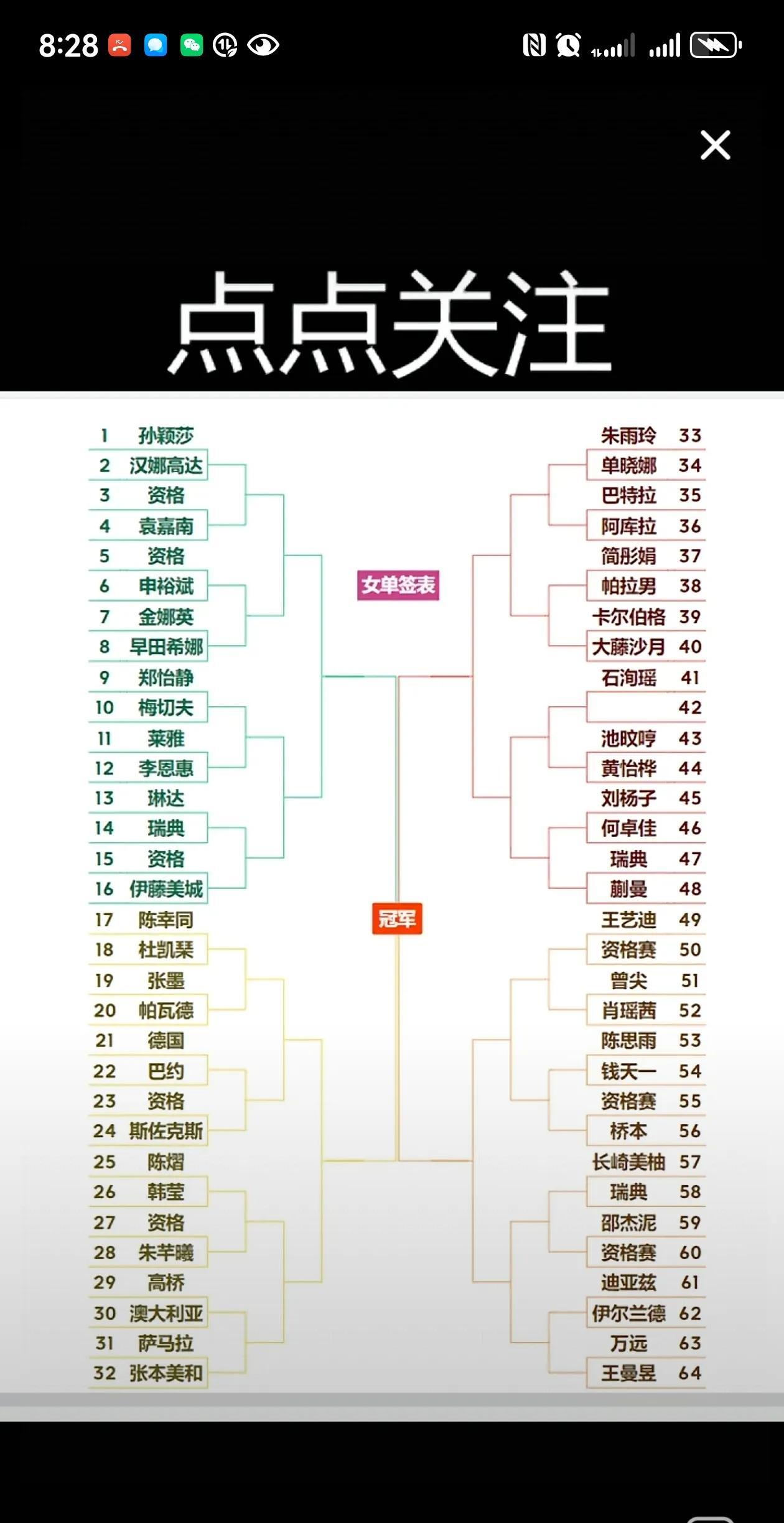 WTT欧洲大满贯(8.14-24):抽签ing,这回签比较硬,陈熠先遭遇张本美和,然后对陈幸同,并与孙颖莎同在上半区。王艺迪7/8区对阵桥本、王曼昱8/8区遭遇长崎美柚,同在4/4区。5/8区为朱雨玲与大藤沙月,6/8区为石洵瑶与蒯曼! 这回让这段时间的黑喷看看吧。