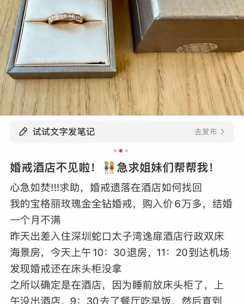 深圳,新婚女子晚上把6万元全钻婚戒,放酒店床头柜,次日,到机场才发现戒指没戴,问