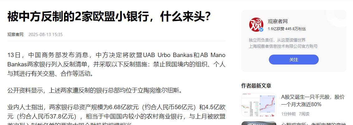 欧盟这双标玩的太嚣张,自己拉黑中国两家银行喊 “合理”,转头就让中国别制裁立陶宛——真当中国是软柿子?这个制裁的苦果,他们得自己咽! 中国商务部一纸禁令,直接冻了立陶宛两家银行的资产 —— 这巴掌打得够响! 欧盟前阵子刚把咱两家地方银行列进制裁名单,现在倒好,自己先扛不住了,法国德国全装哑巴,只能打落牙齿和血吞! 欧盟那套双标把戏真是越演越露骨,发言人吉尔在发布会上左手举着制裁中国的 "证据",右手就骂中国反制 "没道理"。 问他制裁咱银行的实锤在哪,就装神秘 "机密不能说";轮到中国出手,立马跳脚喊 "这是挑衅",这种只许自己耍横、不许别人还手的无赖样,谁看了不恶心? 要说欧盟为啥敢这么干,还不是跟着美国学坏了,想靠制裁拿捏俄罗斯,偏要拉上中国的银行垫背,真当咱还是任人拿捏的软柿子? 立陶宛更是上蹿下跳,这些年在台湾问题上没少找茬,这次主动撺掇欧盟把中国银行写进制裁名单,以为抱上欧盟大腿就能横着走?做梦! 中国这反制可太精准了,挑的两家银行,一家管着立陶宛三成中小企业贷款,一家握着四成农产品出口结算,专打他们的七寸。 现在好了,他们的企业贷不到款,农产品卖不出去,全是自找的!欧盟承诺的 "补偿",也就嘴上说说 "考虑设个基金",真金白银连影子都没见着。 最逗的是立陶宛外长,跑到布鲁塞尔哭诉求援,德国财长直接怼回去:"你当初驱逐中国外交官时,跟我们商量过吗?" 欧盟那些大国心里门儿清,谁愿为了立陶宛这颗小棋子,跟中国闹翻?法国德国全装聋作哑,说白了就是让立陶宛自生自灭。 俄罗斯看得明白,中国这一击,不光打疼了立陶宛,更让欧盟的制裁体系露了馅。 他们以为能靠制裁当武器,殊不知中国早有准备,区块链结算、本币直连,条条大路通罗马,哪能被他们卡住脖子? 说到底,欧盟就是搬起石头砸自己的脚。想拿中国当棋子,就得有承受反制的觉悟。 立陶宛这种跳梁小丑,也该醒醒了:跟着别人起哄架秧子,最后买单的还是自己!