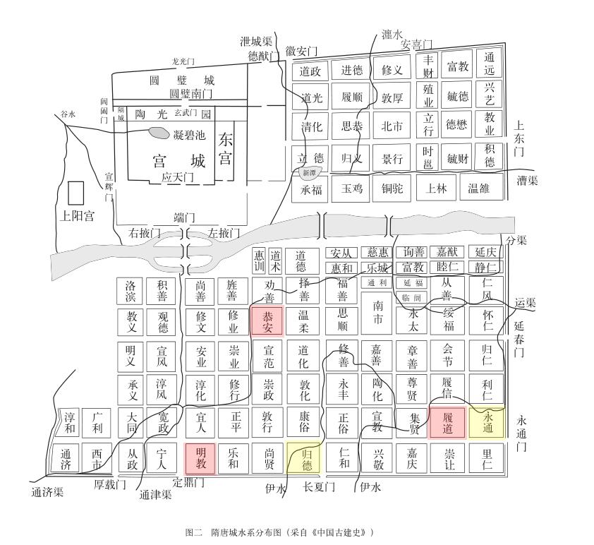 隋唐洛阳城有外郭城、皇城、宫城三重城垣。总面积约51.9平方公里,城内规划了3市109坊。