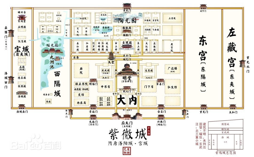 宫城又名紫微城,位于皇城北部,由大内、西隔城(九洲池)、宝城(西夹城)、东隔城(东宫)、左藏宫(东隔城)组成。