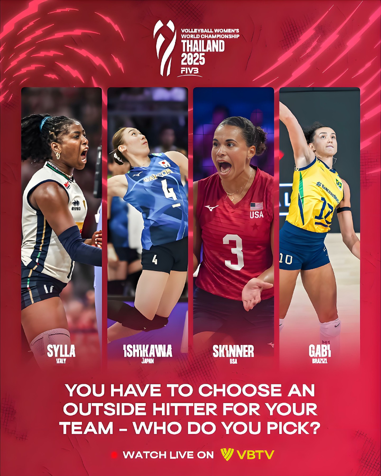 【主攻四大球星你选谁组队?】 国际排联女排世锦赛互动问答 以下四大主攻位置上各有特色的球星 你选谁组队征战泰国世锦赛? ✨ PICK YOUR OUTSIDE HITTER! ✨ Four stars, four styles 🌟 who's leading your team in Thailand? 🇮🇹 Sylla→意大利-塞拉 🇯🇵 Ishikawa→日本-石川真佑 🇺🇸 Skinner→美国-斯金纳 🇧🇷 Gabi→巴西-加比 话说,咱们的吴梦洁和庄宇珊 不比日本这位身高只有174cm的差吧!