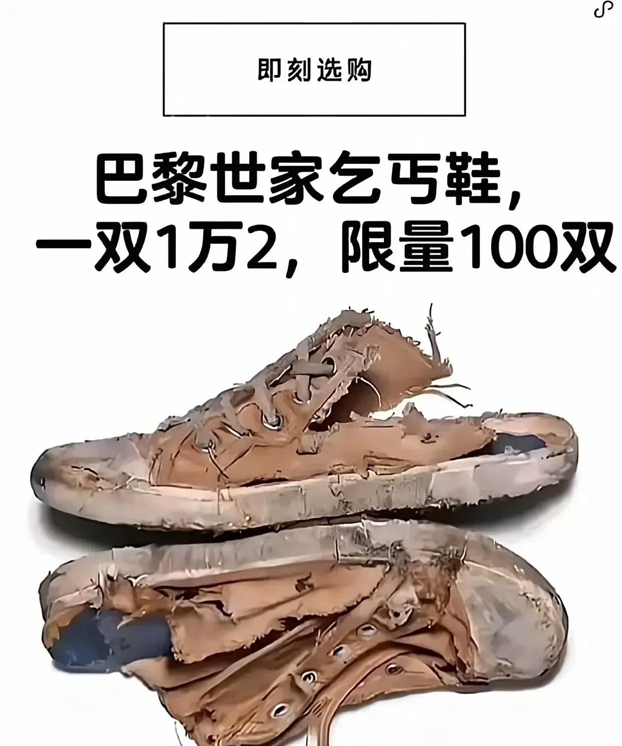 “你嫌人家穿的烂,人家嫌弃你穷。”还好,巴黎世家新款乞丐鞋,不坑穷人。 你别嫌弃,这乞丐鞋标价可不低,就这双破烂球鞋标价1.2万元,问题是限量牌、仅有100双,手慢无。 这双烂拖鞋标价1500美元,有的说,“我家也有一双这样的拖鞋,是给一岁多“毛孩子”磨牙用的。”你那叫破烂,人家叫巴黎世家限量版。 网友评论,“拿穷人的东西卖给富人,说明商家有良心。” “破破烂烂,街上垃圾桶里随便找一双、就比巴黎世家乞丐鞋强,不坑穷人就好。” “这是智商税,你到巴黎大街上看看,有多少富豪穿这些鞋子,拿到中国专骗脑子进水的有钱人。” “这个好,以后俺穿破烂,别人以为我是大富豪呢。” “谢谢巴黎世家,不吭骗穷人。” “天天大鱼大肉吃够了,想吃萝卜咸菜换换口味。”