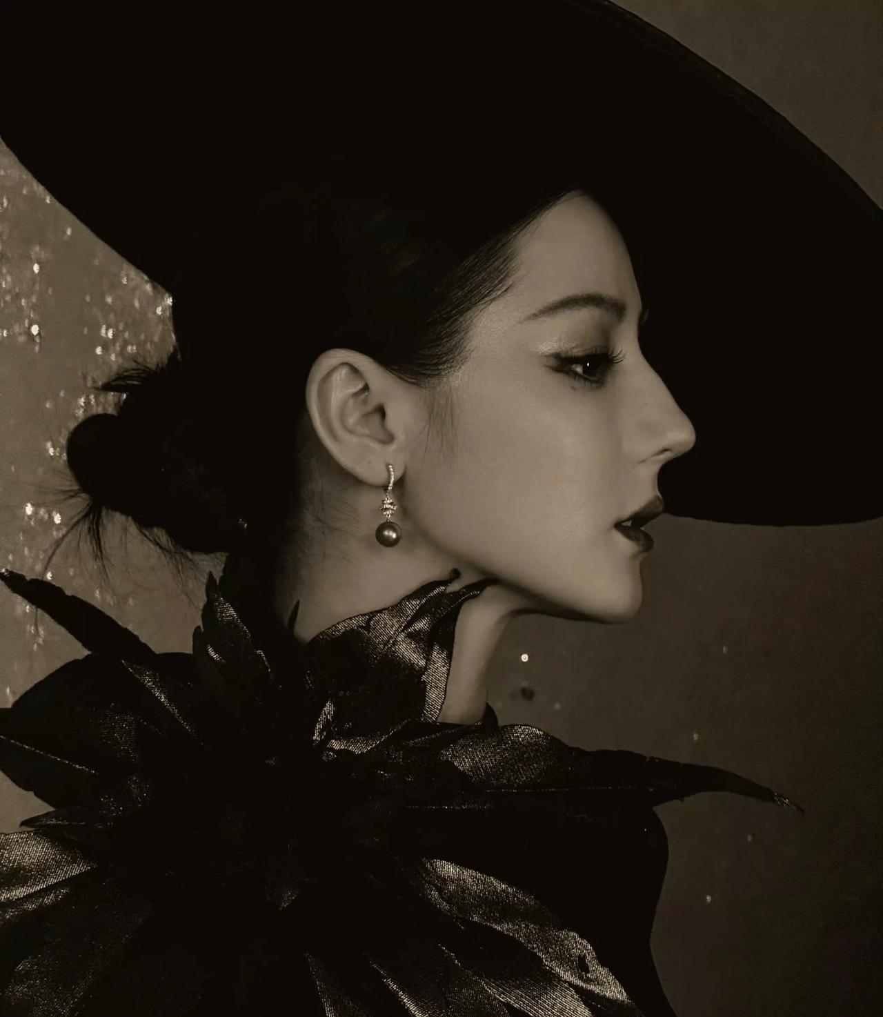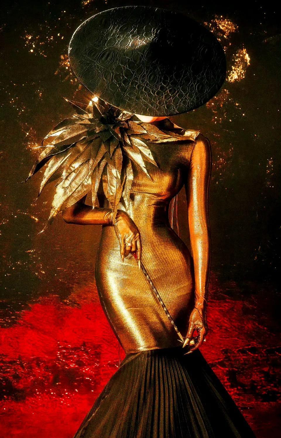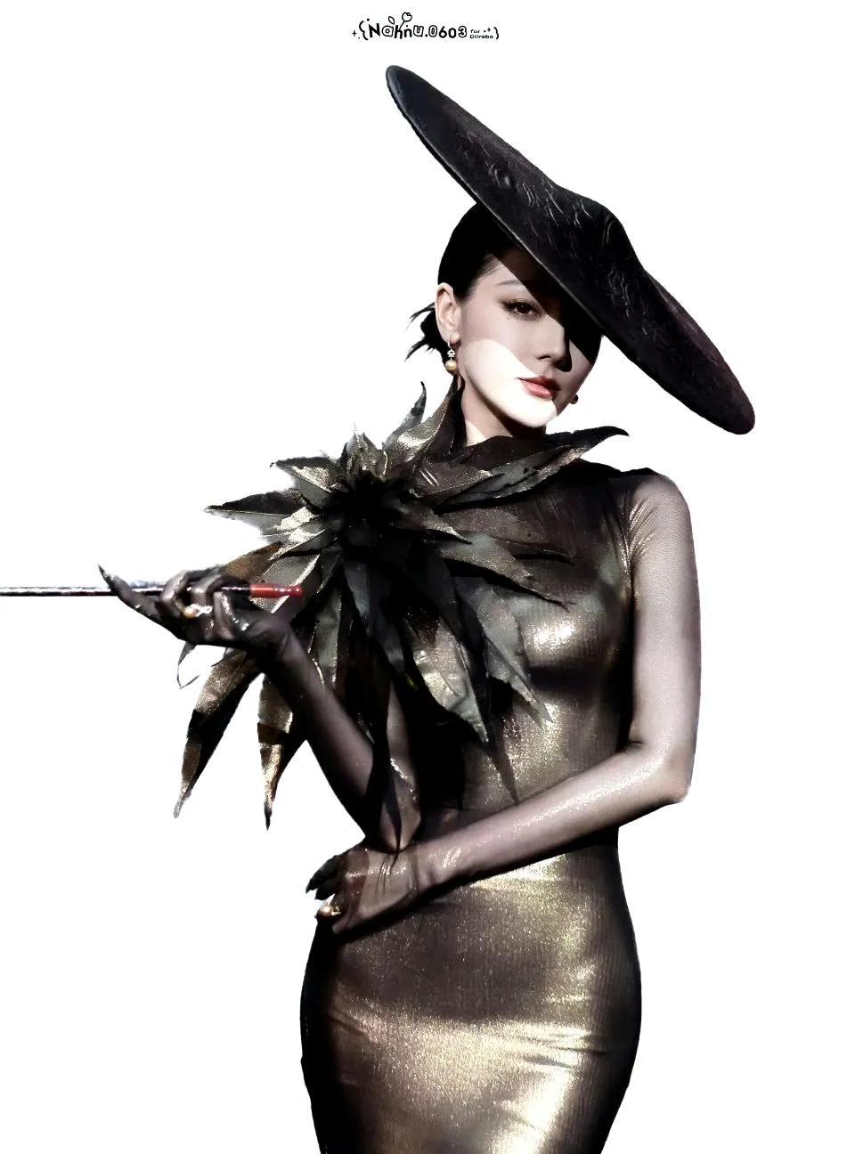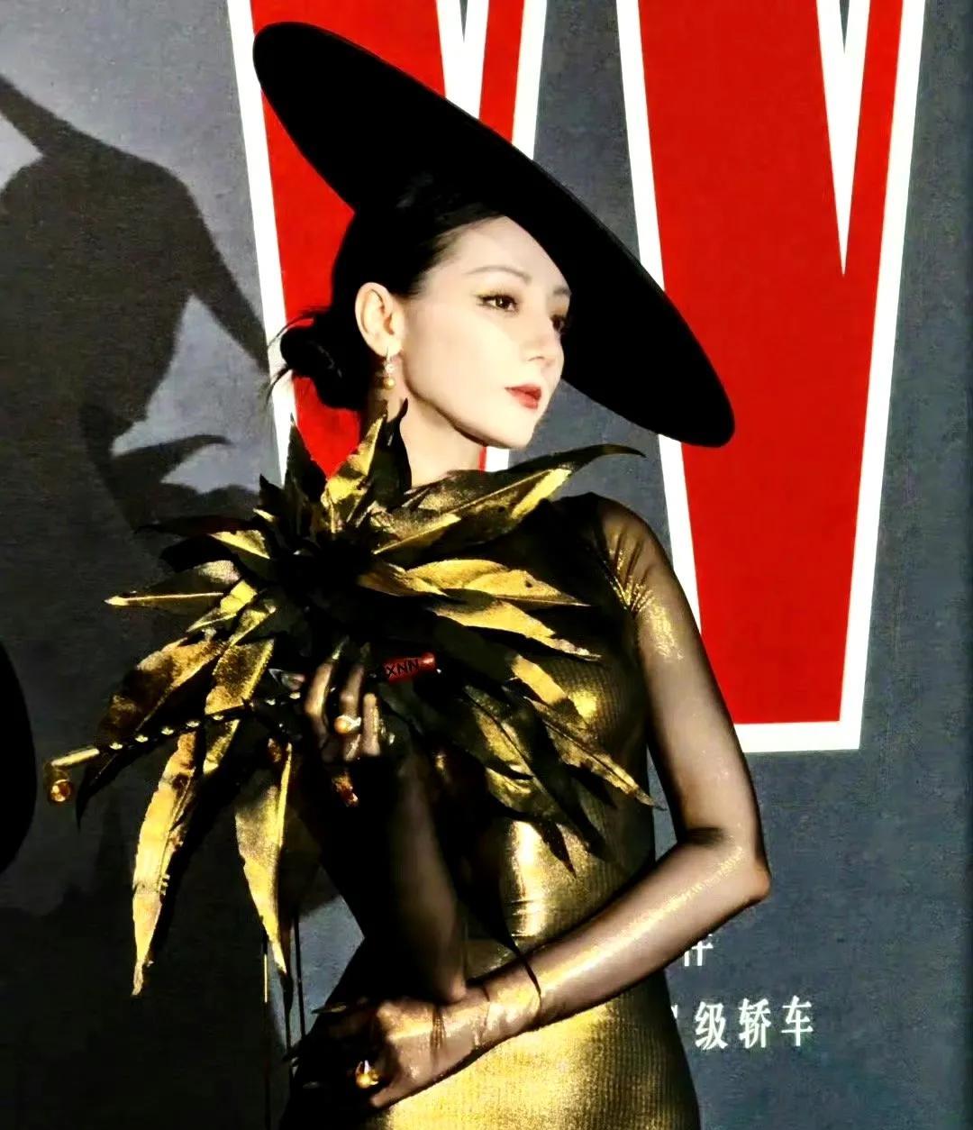W盛典红毯上,迪丽热巴身着黑金渐变紧身裙,搭配夸张宽檐帽与肩饰,手持权杖摆拍,造