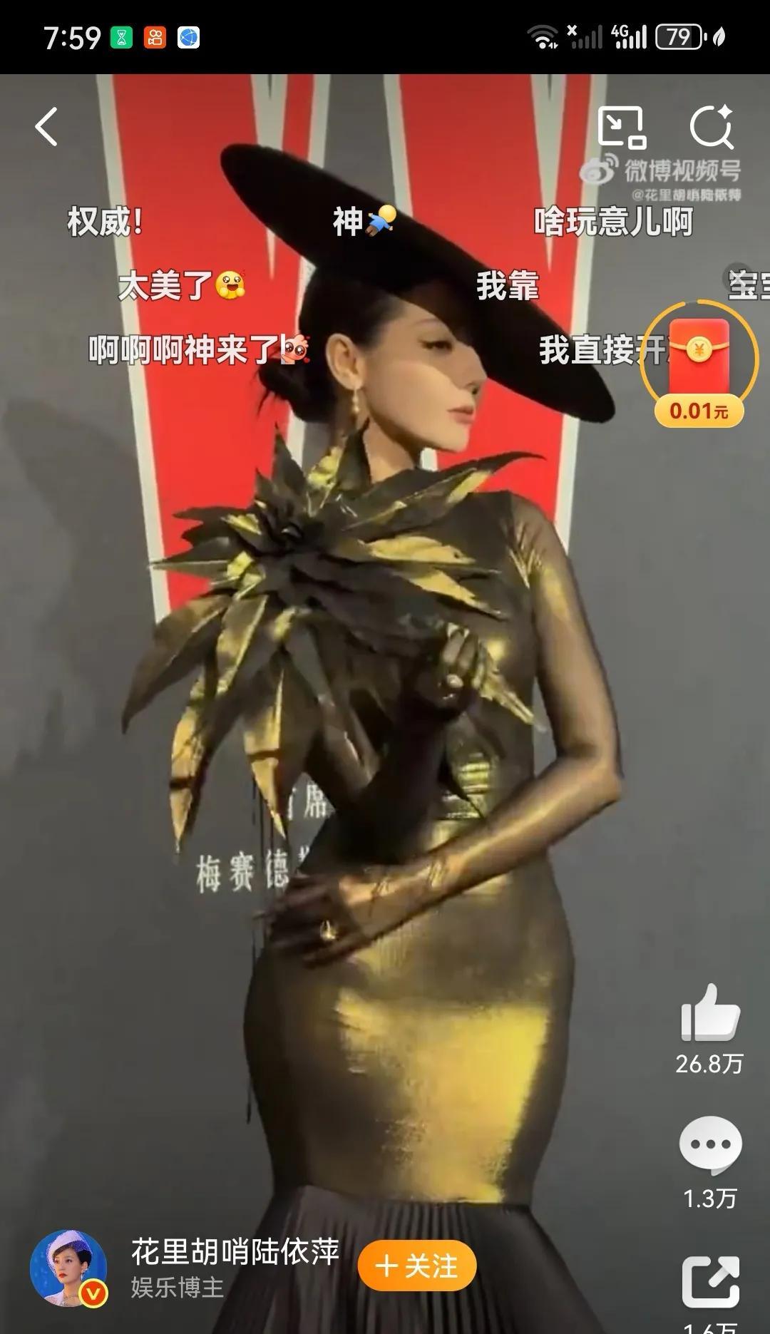 W盛典红毯上,迪丽热巴身着黑金渐变紧身裙,搭配夸张宽檐帽与肩饰,手持权杖摆拍,造型华丽有“主人”气场;该视频由娱乐博主“花里胡哨陆依萍”发布,168万次观看引发热议,网友狂赞“美神”“玩转红毯的神”,“主人级别”成传播关键词,靠先锋造型和强大气质强化“概念美神”标签,借#W盛典红毯#话题推流,在粉丝与路人中掀起讨论潮。