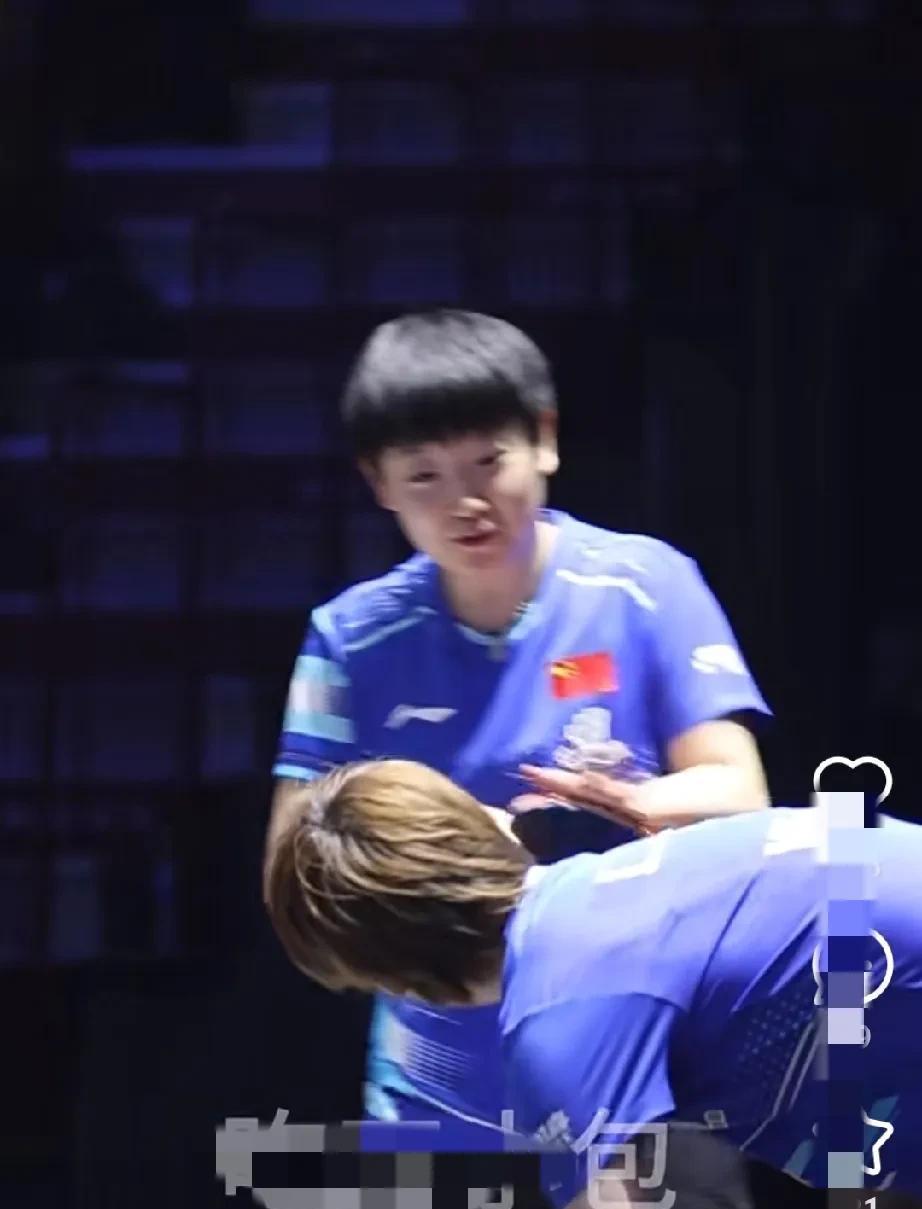 邱贻可也来看海产的女双比赛。 今天是孙颖莎/王曼昱女双首秀,俩人穿了蓝色比赛服,