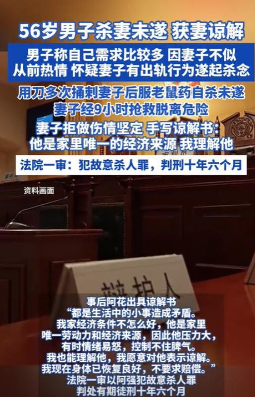 “太离谱!”一56岁男子平均每天都要和妻子行房,可妻子却没了兴致,男子怀疑妻子出轨,于是持刀捅了妻子几刀,随后服老鼠药自杀,但未能成功。然而妻子康复后却坚持要出谅解书,称男子是家庭收入来源,家里不能没有他。法院判了! 张先生(化名)和妻子有着幸福美满的家庭,然而就是因为他自己的一些想法,差点让自己和妻子损失掉生命! 事情的起因还得从张先生说起,已经56岁的他,有着特别强烈的需求,基本上张先生每天都得和妻子行房事,平均下来每周都得有五六次的X生活! 但是作为丈夫的张先生并没有觉得不妥,反而他认为这是他一直爱妻子的原因,假如有一天自己不想和妻子行房事了,说明自己对妻子已经没有了感觉,这段感情也将要走到尽头! 虽然张先生的妻子对此并没有说什么,但是她的年纪和张先生相同,自己已经渐渐的没有那么强烈的需求了,奈何自己的丈夫欲望太强,作为妻子的她,也实在是没有办法! 然而最近一段时间,张先生一如既往的向以前一样,每天晚上都要找妻子,奈何妻子实在是特别不想,于是便拒绝张先生的要求,紧接着面对妻子的拒绝,张先生瞬间愣住了,因为这是妻子第一次拒绝他,顿时间张先生的脑海里冒出了各种想法! 遭到拒绝的张先生,第一时间觉得自己妻子肯定是外面有人了,要不然不可能拒绝自己的,坐在客厅生闷气的他,越想越生气,一气之下竟然前去厨房,拿了一把水果刀,直接来到妻子的跟前,质问那个男人是谁! 妻子一脸懵的不知道该怎么回答张先生,自己只是没有那方面的想法了,并不是外面有人了!然而愤怒至极的张先生根本不相信妻子所说的话,见妻子还不愿意承认,直接捅了妻子好几刀,妻子拼命的挣扎,跌跌撞撞的从家里逃出,连忙拍打邻居家的大门寻求帮助! 张先生见妻子已经负伤,他眼角流出了眼泪,并没有选择出门追妻子,而是在家中翻出了老鼠药,吃了一整瓶后,躺在了家里静静等待着死亡的到来! 然而张先生并没有如愿以偿的离世,因为邻居见张先生的妻子浑身是血,立即拨打了报警电话,当时张先生的妻子已经昏迷过去,在救护车到达后,他也前去张先生的家里查看,发现躺在地上的张先生,立即呼叫了救护人员,将他们夫妻二人一同送往了医院救治! 夫妻二人经过医生的一番抢救,都已经脱离的生命危险,这还是也被警方进行调查,最终确定了行凶者就是张先生,警方将案件移交至法院进行判决!然而张先生的妻子却表示,自己的丈夫肯定是压力太大了,并且表示最近家里的经济不好,所以妻子理解张先生,表示肯定是压力导致他失控了! 那么,对于这件事,大家有什么看法? 信源:津云刊