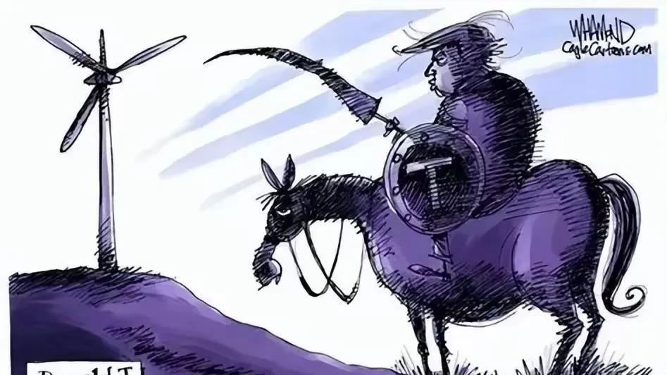 长枪被磨钝,战马已生锈,但这些都阻止不了“特吉诃德”向大风车冲锋。“骗局,本世纪最大的骗局”,特朗普把矛头对准了太阳能面板和大风车,劈头盖脸就是一顿输出:“任何依赖风力发电机和太阳能发电的州都在经历创纪录的电力和能源成本上涨”,真不知道特朗普是怎么得出这个结论的,思来想去,只有一种可能,也许在美国,阳光和微风比化石能源更贵!可笑的是,特朗普也许把自己当作唐吉诃德,别人却把他当成福斯塔夫。