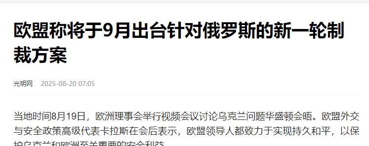 欧盟又宣布了!8月20日,欧盟外交官卡拉斯宣布9月要搞新一轮对俄罗斯的制裁,说是