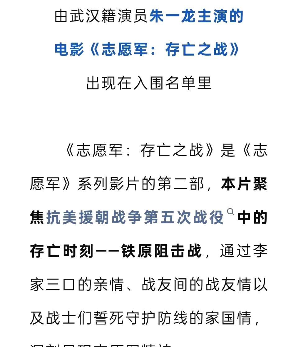 恭喜朱一龙领衔主演的抗美援朝题材电影《志愿军存亡之战》入围第20届长春电影节金鹿