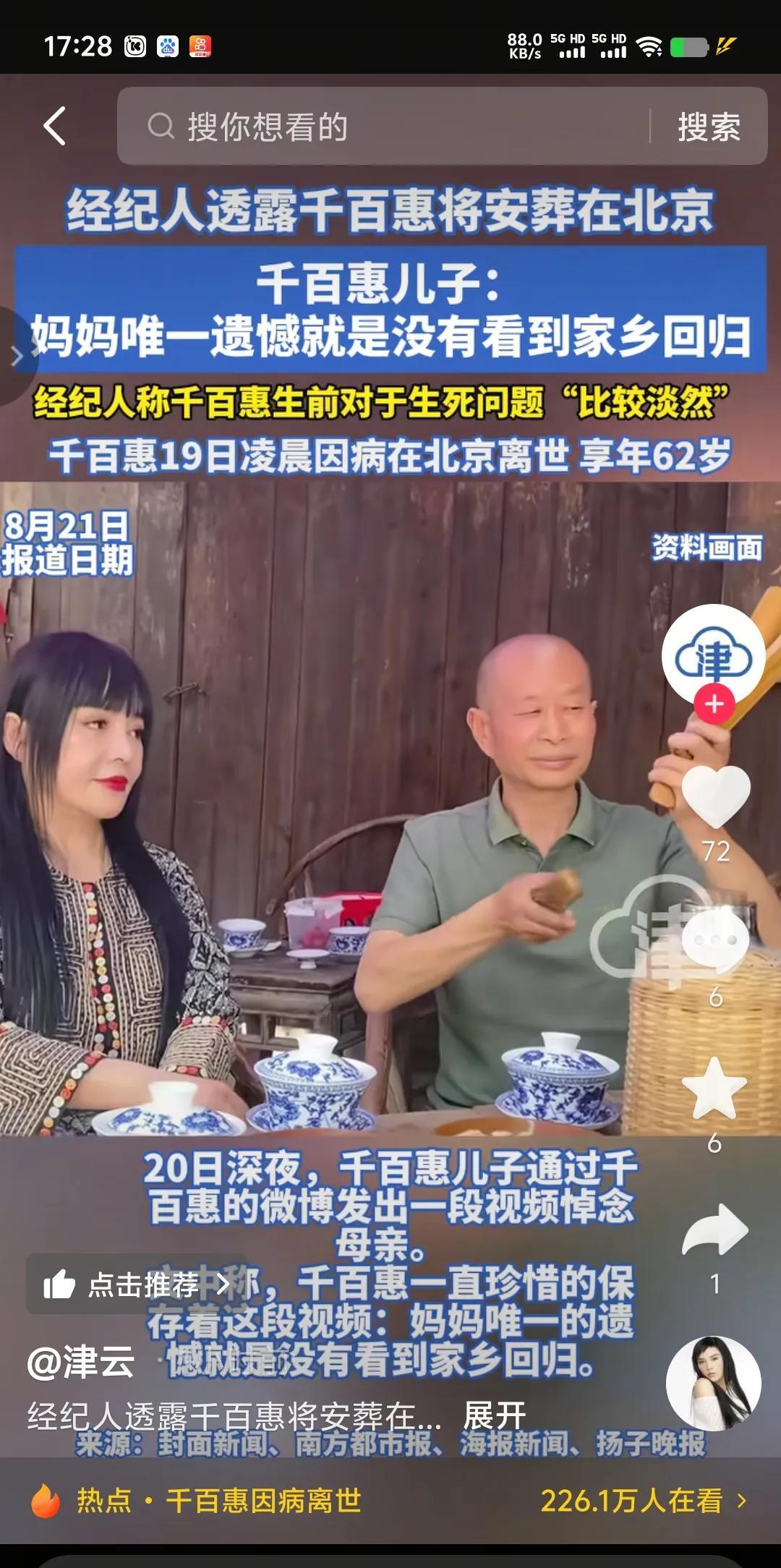 千百惠的离世再一次告诉我们,人不是老了才会死,而是随时都会死。享年62岁,突发疾病,按现在延迟退休年龄来算,刚退休或没退休。原计划24号来山西阳泉演出,谁知道人生无常,每一天都是一个未知数。 具体什么疾病没有官方报道,有人猜测是带状疱疹并发症引起的。千百惠之所以看起来比较胖,是由于常年吃激素的结果。个人更偏向心梗,如果是慢性病导致的,那么应该有抢救的时间,或者说就不会再安排演出,毕竟身体要紧。 所以说人生苦短,挣钱就是游戏,活着才是胜利。健康是目的,快乐是真谛。有钱把日子过来,没钱把心情过好。