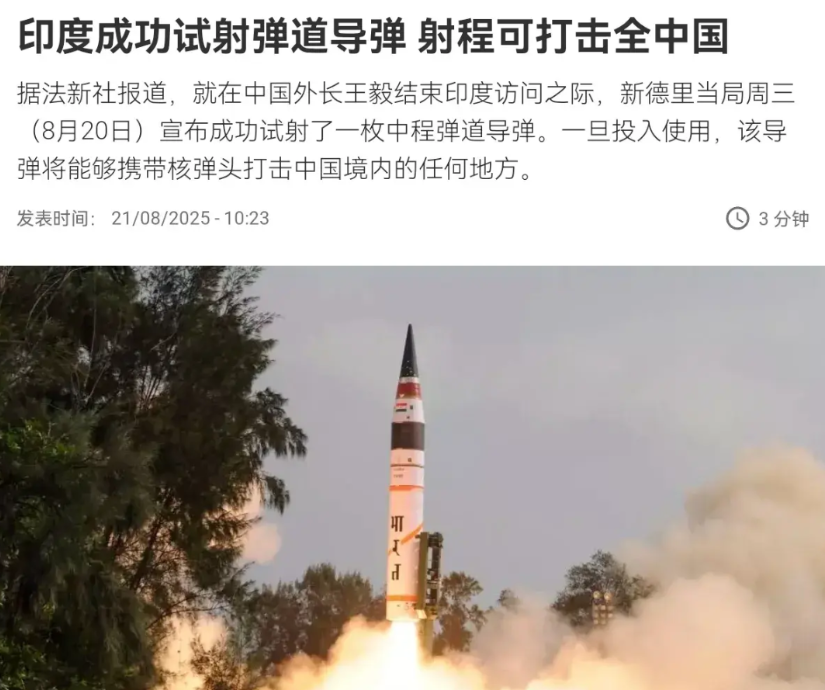 印度这是故意的吧!王毅外长刚走,印度就发射可打击中国全境的烈火-5”导弹。虽然说,我们可能并不太在意,但是印度以发射导弹的方式送我们的外长离开,确实不地道。8月21日,法媒报道称,就在中国外长王毅离开印度之际,新德里当局周三(8月20日)宣布成功试射了一枚中程弹道导弹,该导弹将能够携带核弹头打击中国境内的任何地方。