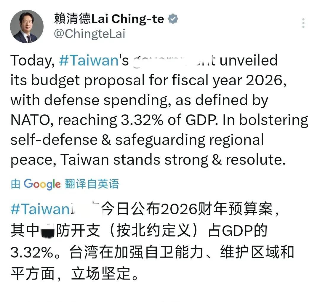 赖清德今晚(8月21日)写道:“台当局今天公布2026财年预算案,其中防务开支(