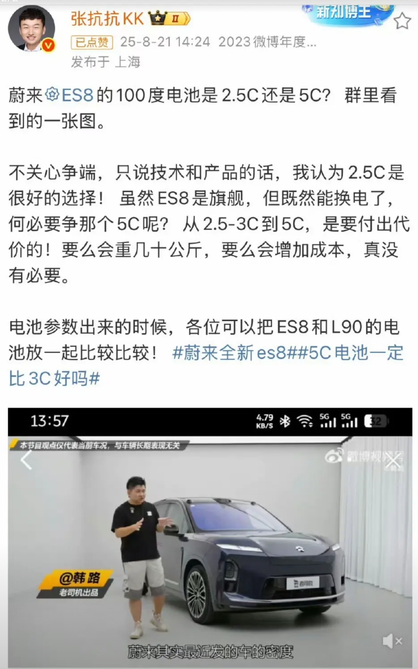 5C电池一定比3C好吗 韩路以为新蔚来ES8只有2.5C,抗博@张抗抗KK 认为