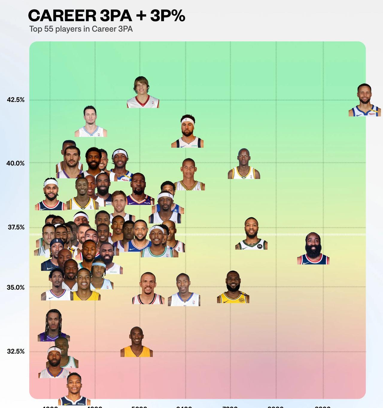 三分领域的GOAT:定义时代的传奇射手们! 1. 库里 他的三分出手数和命中率都遥遥领先于其他所有人。他是产量历史第一和效率历史顶级的完美结合体,是公认的历史第一射手。 2. 雷·阿伦 在库里超越他之前,他是历史三分王。产量巨大且效率稳定,是古典射手的典范。 3. 哈登 他的三分总出手数仅次于库里和雷·阿伦,他的命中率可能略低于雷·阿伦,但无与伦比的产量尤其大量后撤步三分让他稳居前三。 4. 克莱·汤普森 产量很高,同时效率极高,仅次于库里。他是历史顶级的无球射手,以高产高效著称。 5. 雷吉·米勒 作为上一个时代的标志性射手,产量和效率都不错,在历史上一直名列前茅。 6. 科沃尔 命中率极高,超过42%,虽然他的总出手数不是最顶尖的,但他的极致效率足以让他跻身顶级射手行列。 7. 利拉德 产量很大,效率也不错。他以超远三分著称,产量积累迅速,是新时代高产量射手的代表。 8. 卡特 他的总出手数非常高,命中率则保持在联盟平均以上水平。凭借超长的职业生涯积累了巨大的产量。 9. JJ·雷迪克 类似于科沃尔,他是高效射手的代表。命中率也高,同时产量也达到了相当的水平。他的整个职业生涯都以精湛的无球跑动和投篮著称。 10. 斯托亚科维奇 他是00年代最伟大的射手之一,他的命中率很高,超过40%,产量在当时是顶尖的,放在历史长河中依然可观。 由此可见,历史顶级的射手需要同时满足两个条件:巨大的职业生涯产量和可观的投篮效率。 库里之所以是独一档的存在,正是因为他在两个维度上都达到了前所未有的高度。 #NBA吐槽大会# #头号创作者激励计划#