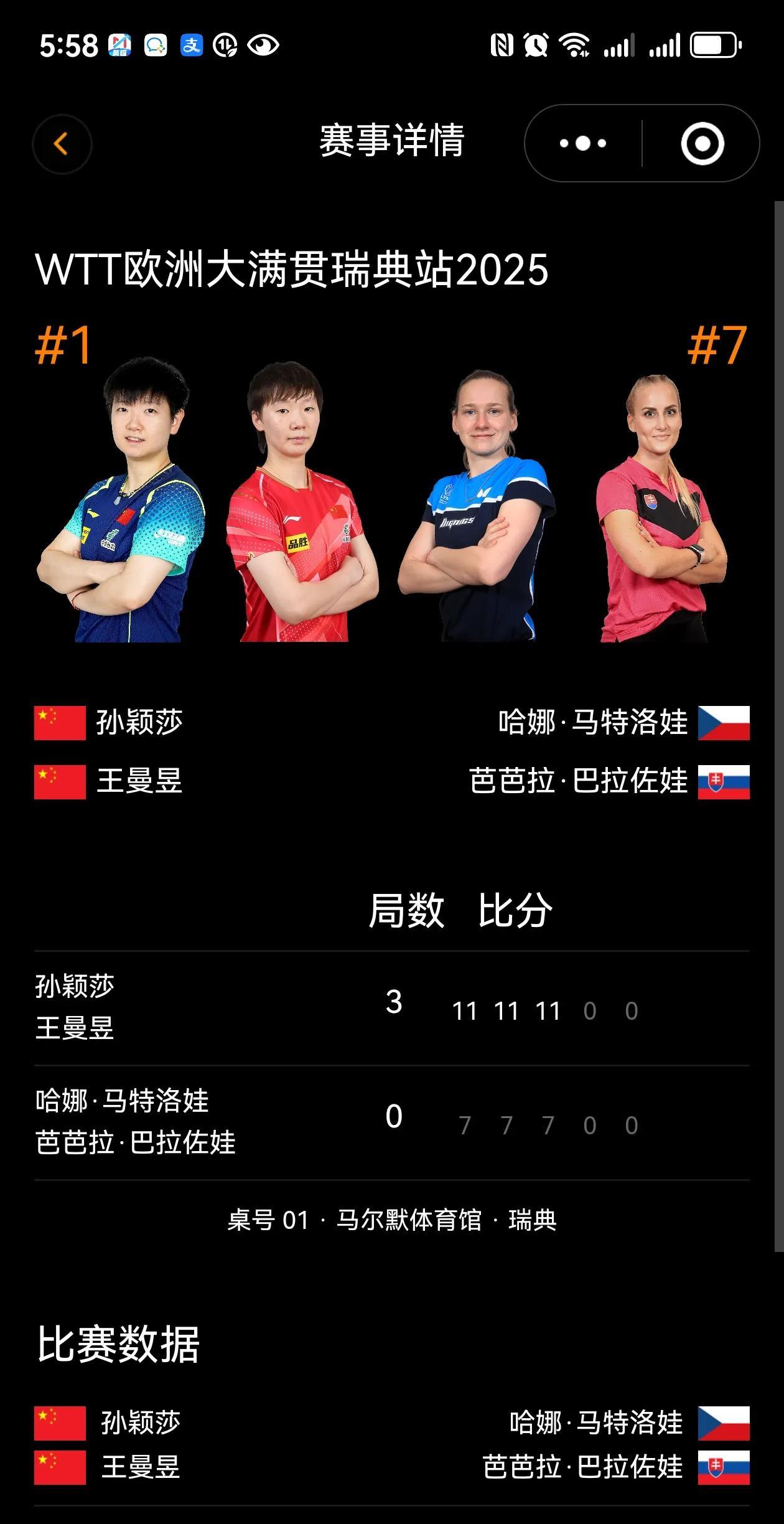 WTT欧洲大满贯瑞典站(8.14-24)当地21日午场,混双动漫组合,晋级决赛;