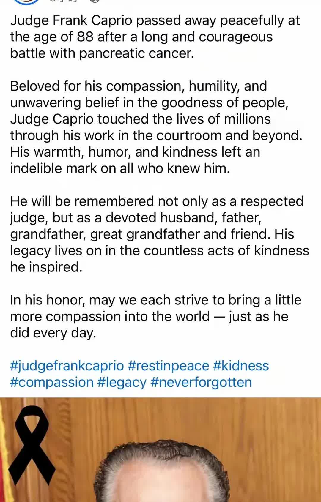 这位善良的美国法官弗兰克卡普里奥8月20日去世,这位法官以充满人性光辉的法官享誉全球,以柔性法官著称。 有位单亲妈妈多次违章停车,面临400美元罚款,该法官了解到其家庭困境后将罚款降到50美元,后来了解到该单亲妈妈兜里只有5美元现金时撤销了其全部罚款,也有人认为他过度同情弱者而削弱了法律的威严。 自己淋过雨才愿意为别人撑伞。他回忆称自己幼年家庭贫困在被送到法庭时,遇到一位法官以温和态度处理案件,不仅没有对其家人进行处罚,还帮助其父亲重返工作机会。 这段经历深刻影响了弗兰克,他成为法官后也开始以柔性执法方式对待弱者。 善良是不分国界的,哪怕他是一个美国人。