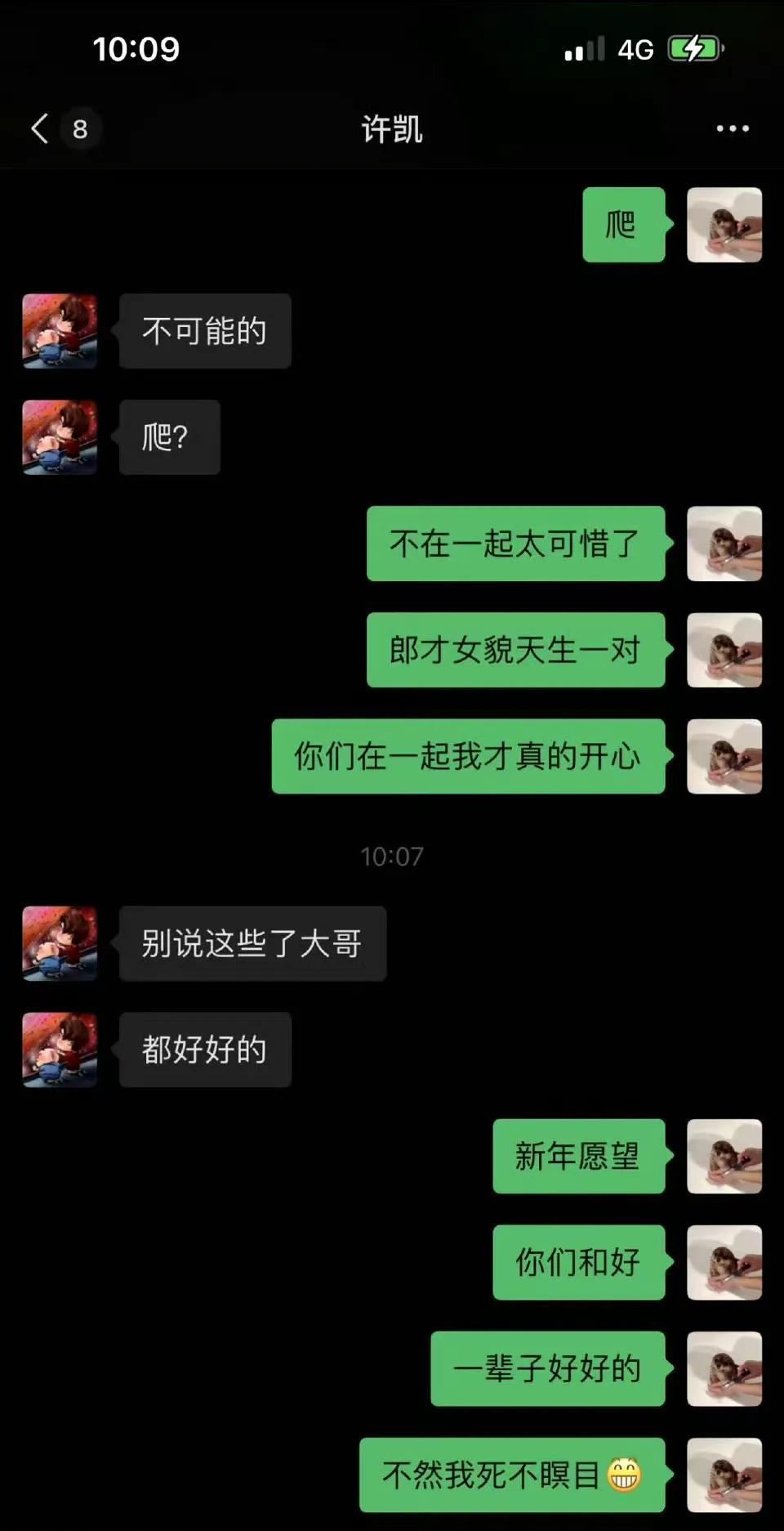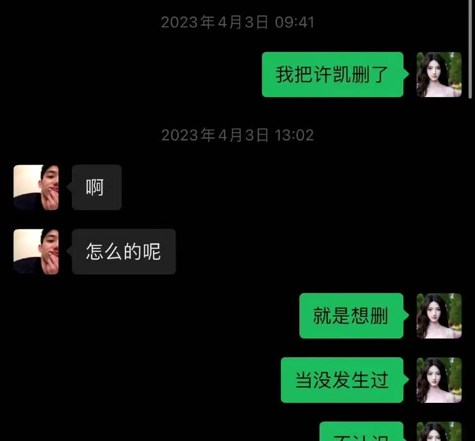 2021年,某艺人生日宴上,我在欢娱公司的包厢里第一次见到许凯。转天,剧组朋友组局,地点恰好在他家里。那天他主动要了我的联系方式,朋友们散场时,他留我多待一会儿。酒劲上头的他拉我到门边亲了过来,不等我反应就脱了衣服,我正被吓得不知所措,他却醉晕过去,我趁机跑了。 之后两天,他频繁联系我,送礼物时解释说喝断片记不清了。我想着或许是酒精作祟,没再多提,一来二去便交往起来。直到2022年1月,一场误会让我们暂时分开。 同年8月,我去横店拍戏,恰好他也在那边工作,重逢后他解开了误会,我们重归于好。这次感情升温,他让我和他父母视频,还约好全家去看海,那段旅程我盼了很久。 年底我拍完戏回重庆居家隔离,一个月没能见面。12月18日我阳了,发烧到整夜睡不着,中午刷到许凯和赵晴同进酒店的热搜,病中情绪本就脆弱,瞬间崩溃。我在匿名小号写了很多宣泄的话,全程没指名道姓,只是记录心情,没想到还是被他粉丝扒了出来。 那段时间我总找他吵架,追问到底怎么回事,他却只用公关话术搪塞。 年后许凯去青岛进组,期间又认识了别的女生。他骗我说戒了酒、在运动,实则忙着劈腿陪人家。 2023年2月他进新组,看上同组女演员,通过casting团队几次约见,还带她去商k喝酒。商k打烊后,他和朋友说没喝够,转场到他的酒店套房继续。酒局上他不停示好,最后让朋友支开所有人,用当初对我的方式对待她,好在女生也跑掉了。 两年后,我偶然得知了这些事,还有些更颠覆三观的内情,既困惑又震惊。 他出轨后这么多年,从没正式道歉,更没任何补偿。恋爱时他转的六千块,还是朋友打牌输给她,他让朋友转给我的,我转回给他,他没收,这是我们唯一一次转账往来。