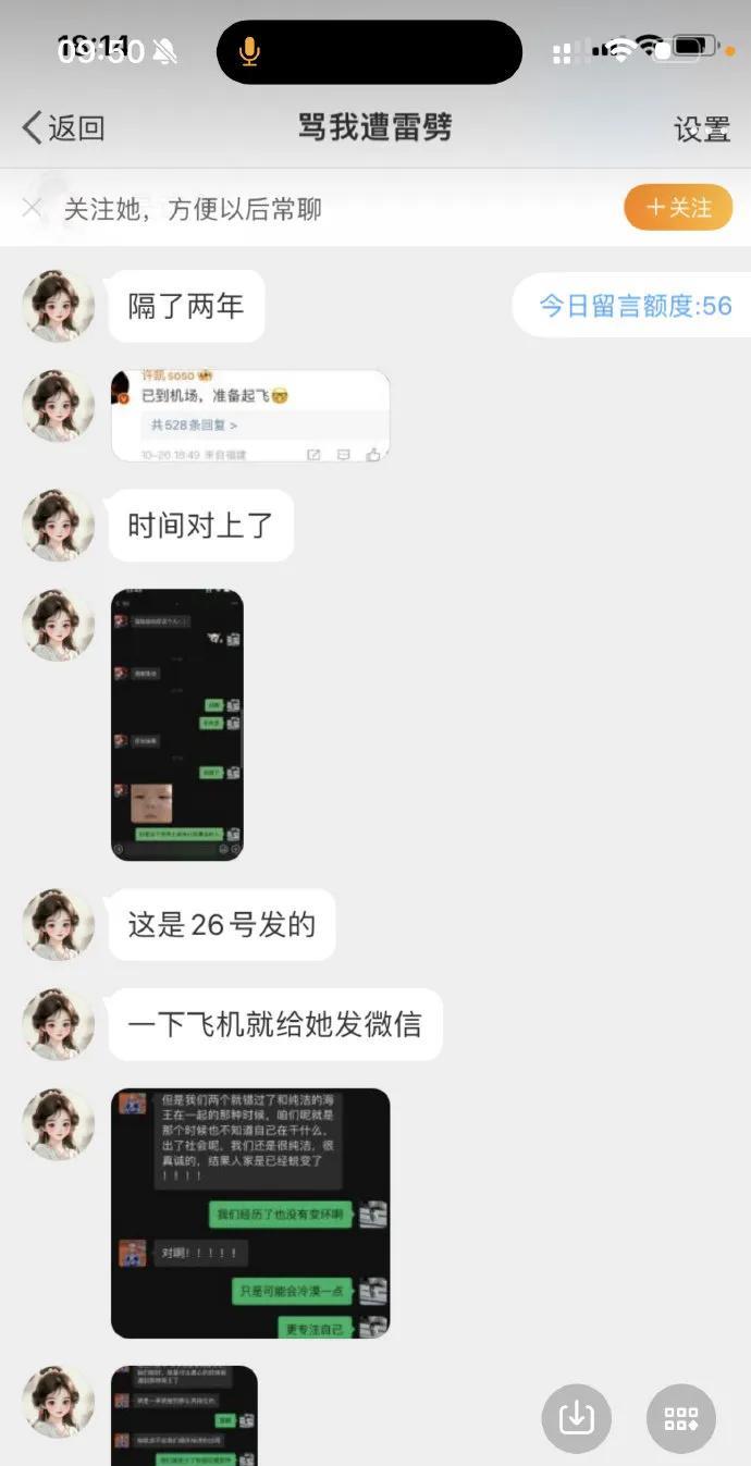 这些年出了这事儿,我从没打算跟许凯撕破脸。就算他粉丝来问,我也只说不认识他。不少聊天记录早就清了,倒是以前有他的粉丝截过我小号的图私信来,还有些零碎的留着。