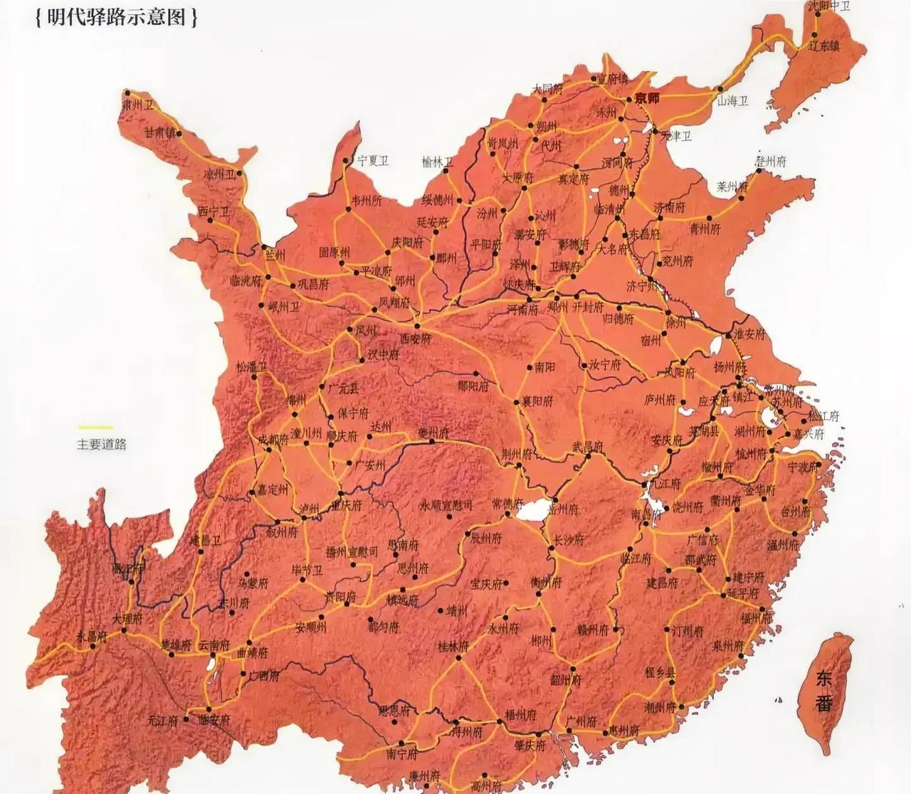 明朝驿站分布图 明朝由驿站和驿道构建而成的驿传系统仿若现今的高速公路网,纵横交错地将两京十三省连接起来。 驿站在古代有着极为重要的作用,驿马飞奔疾驰,传递着与国家命运息息相关的消息。它是为了紧急递送政令、传送军情而设立的。早在春秋战国时期便有了其雏形,到秦汉时已成为国家的“快递公司”,隋唐时期则不断加密。并且,依据运输方式的差异,驿站可分为水驿、马驿和水马驿。