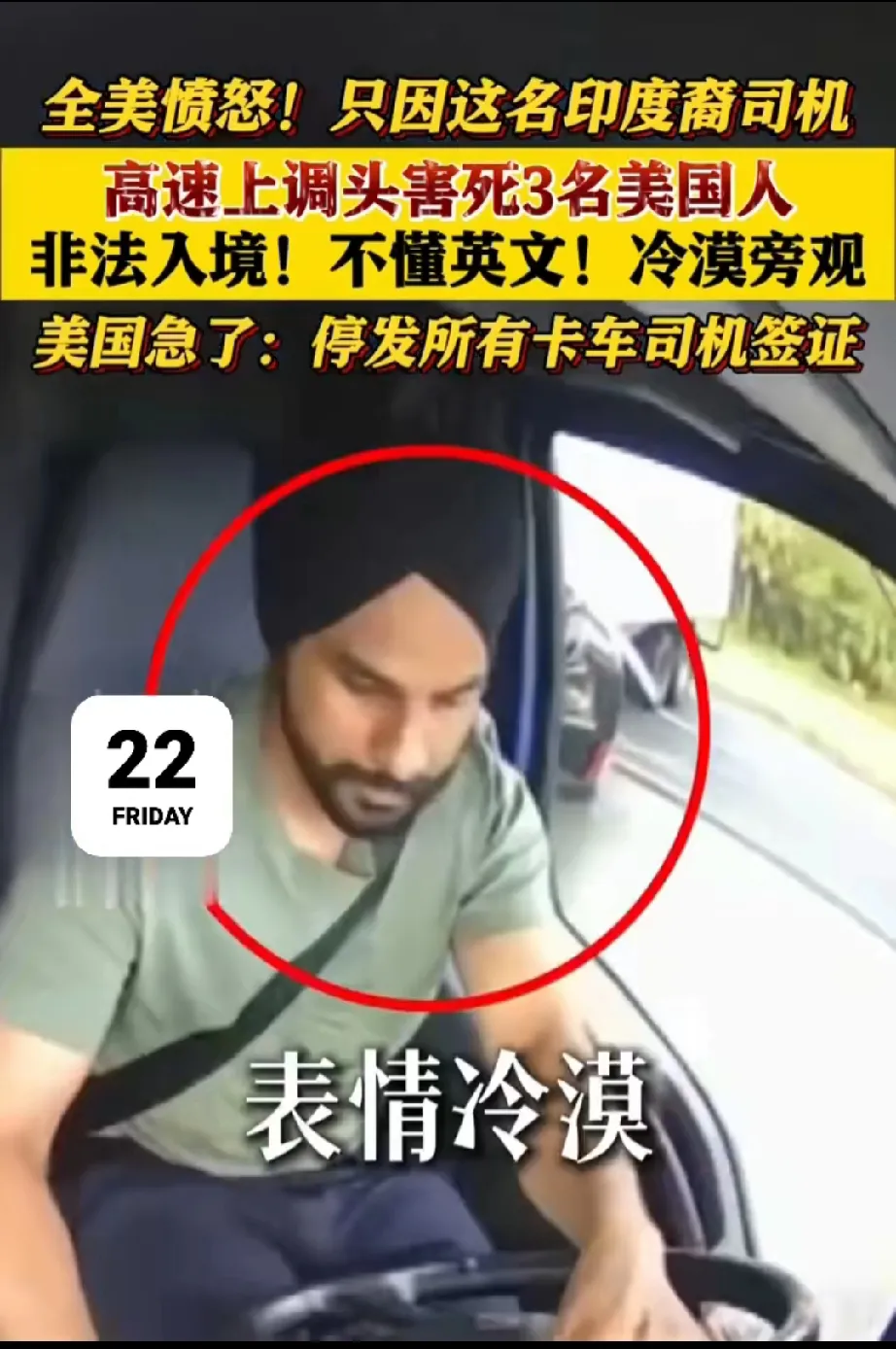 一场本可避免的悲剧,正撕裂着美国的移民共识。美国人这回真怒了,日前,一名持工作签证入境的印度裔卡车司机在高速路违规掉头,酿成3名美国公民死亡的惨剧。现场视频显示,涉事司机事发后漠然的态度更是点燃全民怒火 事司机被曝英语沟通能力存疑,如何通过需英语考核的商业驾照,竟然开着大卡车在美国高速上随意掉头,于是就发生了这起三名美国公民遇难的惨烈车祸! 更让人气愤的是这个印度裔司机在车祸发生后竟然还毫不在意,现场画面让整个美国人民都咬牙切齿! 都说美国是个移民国家,这件事也许会让美国政府不得不把不移民文化素质的要求写进移民条件里面去!