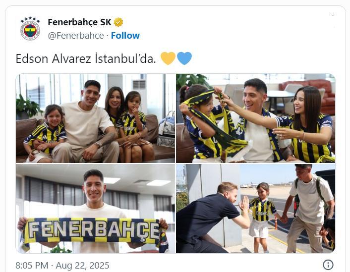 费内巴切社媒确认新援加盟,穆帅心仪中场,终于抵达费内巴切。 费内巴切俱乐部已经在社交媒体上,晒出新援埃德森·阿尔瓦雷斯及其家人,身穿费内巴切球衣的照片,确认这名中场球员正式加盟。 费内巴切确认签下中场球员埃德森·阿尔瓦雷斯,这位墨西哥球星与穆帅将在土耳其,开启新篇章。这是穆帅希望签下的球员,费内巴切通过先租借后购买的条款,满足了穆帅的愿望。 27岁的球员阿尔瓦雷斯迈出了职业生涯中的重要一步,他已经抵达伊斯坦布尔,完成了转会的最后细节。 费内巴切俱乐部发表声明,表明球员埃德森·阿尔瓦雷斯接受了体检并完成合同谈判,然后正式成为球队的新成员。 这名球员在土耳其机场,受到俱乐部管理层的欢迎,球员的家人陪同,费内巴切足球总监奥泽克也表示欢迎。 费内巴切对球员阿尔瓦雷斯的期待,认为他是一名经验丰富的中场球员,是一名领袖。 阿尔瓦雷斯在费内巴切队需要为首发位置,进行竞争,不辜负俱乐部和球迷对他的信心。