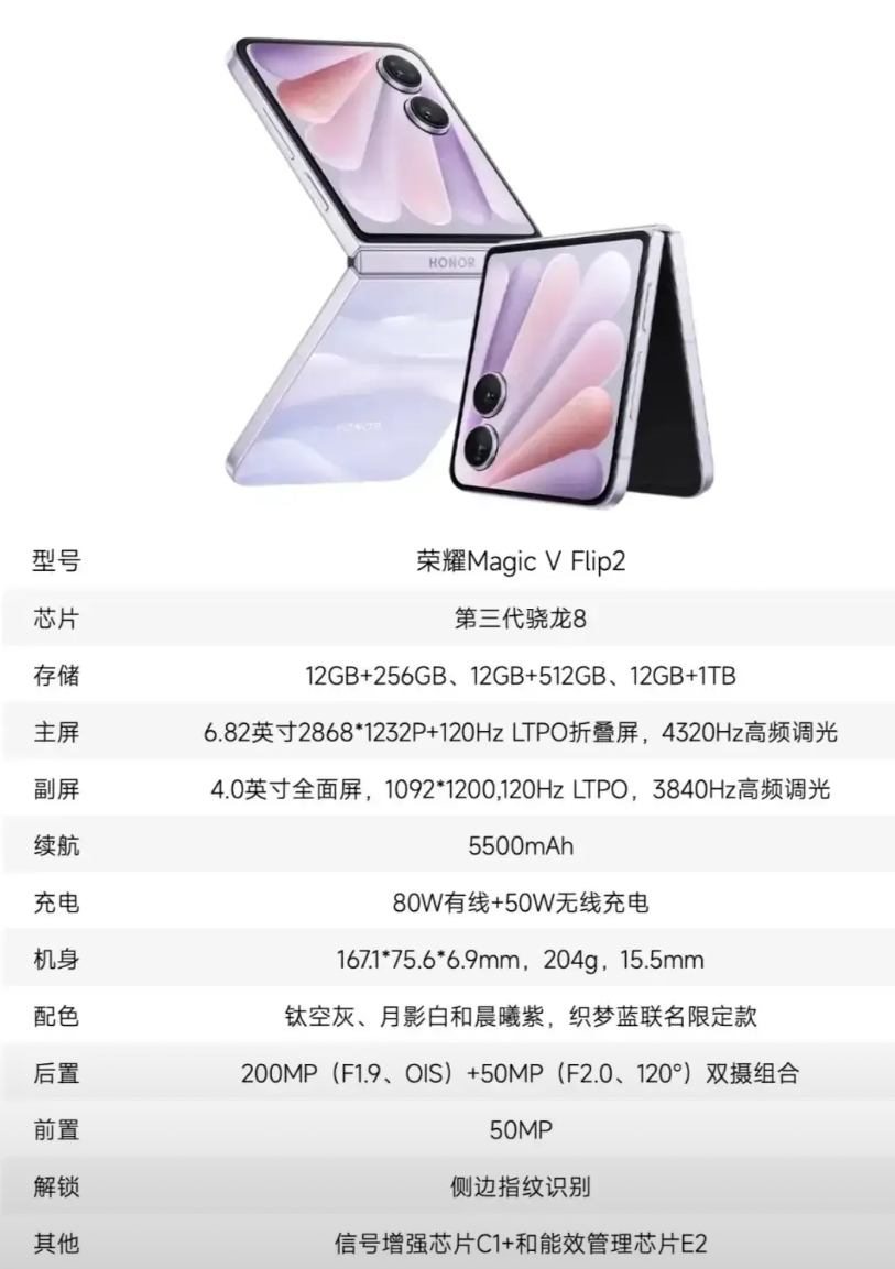 荣耀Magic V Flip2算是给友商和用户一个大惊喜了,骁龙8Gen3+5500mAh电池+50W无线充电
