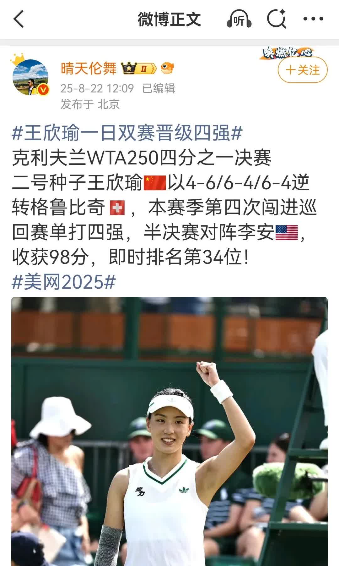 112名也能杀进决赛圈? 中国姑娘把不可能写成了剧本。 王欣瑜在克利夫兰连打两场硬仗,先救赛点再翻盘,把一日双赛变成个人秀场。四强里只剩她一个种子选手,排名却比对手低43位,这反差够刺激。 李安主场作战,球速快、落点刁,但王欣瑜的底线防守像装了弹簧,多拍相持越打越稳。关键分敢变线,反手直线直接钉死角,现场美国观众都忍不住鼓掌。 从资格赛开始,她每场都在刷新个人纪录。没有团队随行,自己订机票、缠球拍,赢球后把护腕往背包一塞就赶下场。这种“独行侠”模式,反而让她更专注。 下一轮如果夺冠,积分直接冲进世界前70,明年澳网就能跳过资格赛。机会摆在眼前,就看她能不能把奇迹再翻一倍。 有时候,排名只是数字,心脏才是王牌。
