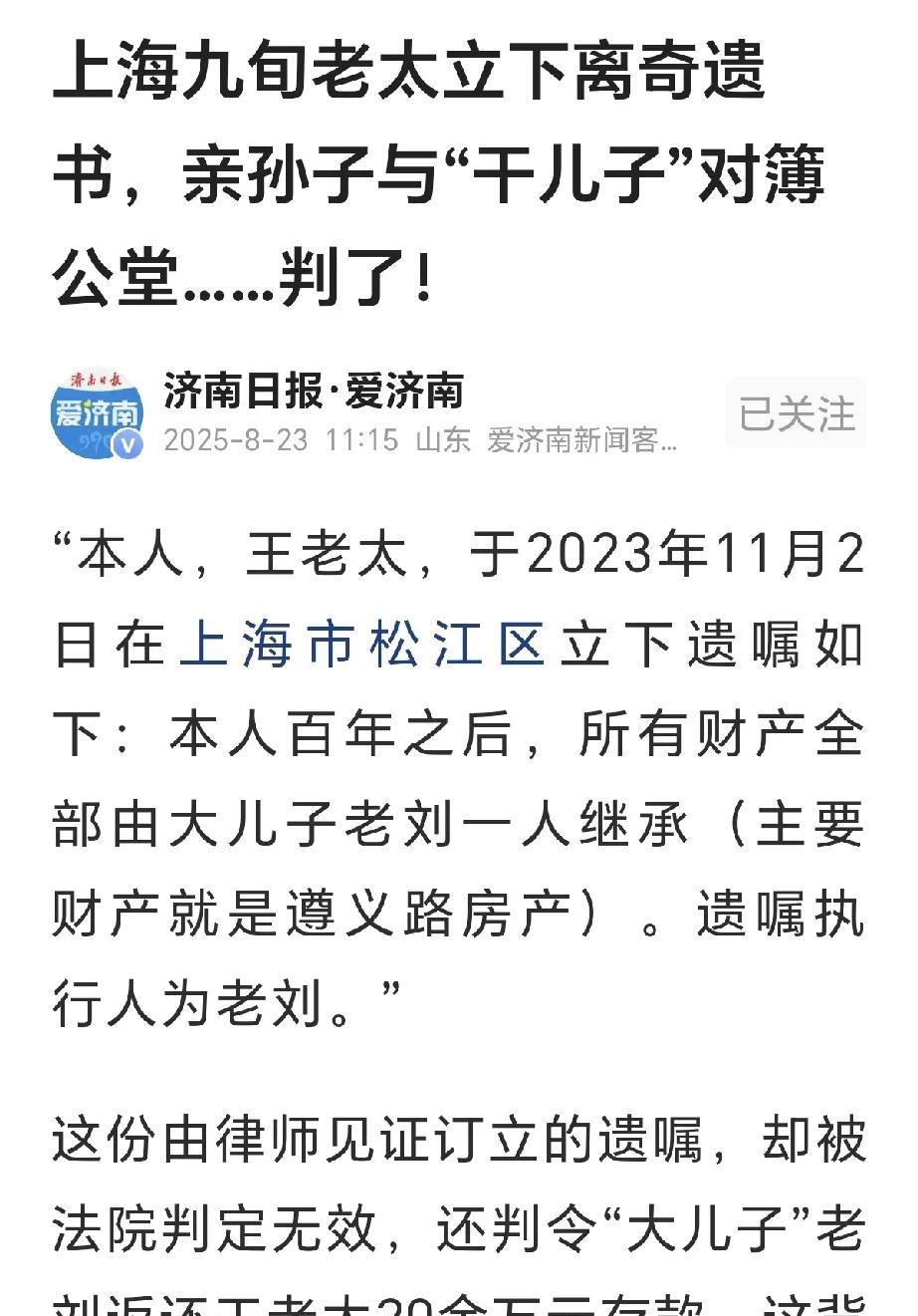 上海,一91岁老太去世,干儿子拿着遗嘱,把老太亲儿女和孙子告到法院,要求继承老太所有遗产,老太孙子不愿意了,奶奶晚年,一直由我父亲照顾,父亲患了重病,才把奶奶送到养老院里,不久父亲去世,我去养老院接奶奶,发现奶奶被干儿子带走,渺无音讯,我找到老家,也不见人,加他v信,他根本不理,奶奶有公证遗嘱,有亲生子女和孙子,怎么可能把遗产全给外人?法院一查,真相可怕,令人瞠目结舌,法院这样判了! 2025年8月23日,据济南日报·爱济南报道,老刘来到法院,自称是王老太干儿子,他拿着老太遗嘱,要继承她全部财产。 据老刘说,王老太年轻时和丈夫离婚,到了晚年,又和子女相处不好。 因此,王老太长期住在养老院里,身患重病,得了骨髓炎,子女不管,不照顾她,也不来探望。 老刘自称,自己小时候学过医,常去养老院里给老人们治病。 他帮王老太治病,治疗有效,王老太十分高兴,认他做了干儿子。 之后,他可怜王老太无人照顾,就将老人从养老院里接走,和自己一同生活。 在这期间,自己对王老太比亲儿子还亲,王老太感动,立下遗嘱,他还请来两名律师作证。 2023年11月2日,遗嘱在律师见证下立好,王老太明确表示,自己去世后所有的财产和房产都由老刘继承。 立遗嘱时,王老太已经91岁,又过了一个月,王老太不小心摔倒去世。 老刘认为,王老太摔伤时,曾紧急抢救,但因年纪太大,抢救无效。 按照王老太的遗嘱,自己应该继承王老太的遗产,因此他来到法院,状告王老太的亲生子女和孙子,要求由他继承王老太全部遗产。 王老太孙子小林接到法院传票,得知自己被老刘告了,他火冒三丈,向法官说道: 这不可能,遗嘱是假的,我奶奶有亲生子女和亲孙子,不可能把遗产留给一个外人。 原来,王老太晚年,一直跟着亲儿子生活,也就是小林的父亲。 可是,2016年时,父亲患上了重病,已经对老母亲无力照顾。 万不得已,父亲把王老太送到了养老院,并不定期前去养老院探望老人。 2019年时,小林父亲病情恶化,走不动了,再也没能去养老院探望母亲。 2020年,小林父亲去世,小林给父亲办理了后事。 后事办完,小林赶往养老院接手奶奶的事,可是,等他到养老院时,却被告知,2019年底,奶奶被干儿子刘某带走,说要带老人回山东老家探亲。 小林追到山东,听亲戚们说,王老太确实在老刘陪同下回来过,去过侄女家,之后离开。 小林找不到奶奶,联系老刘,加他 v 信,老刘不予通过。 小林还说,2014年,奶奶已经立下公证遗嘱,将她的房子留给孙子小林,存款由其他子女按法定继承。 小林认为,奶奶有亲生子女和孙子,不可能把自己的遗产留给外人。 法院立刻着手调查,发现王老太在医嘱中称老刘为大儿子,还说他在部 队 工作,去过好多地方,但没住房,因此把全部财产留给老大。 法官找来遗嘱中的见证律师,律师表示,是老刘联系他们做遗嘱见证人,但老刘没告诉过他们,他并不是王老太的儿子。 而在庭审中,老刘说的和遗嘱中不一样,他说自己没在部 队 工作,也没去过那么多地方,是老太太道听途说的。 他告诉法官,他之所以没通过小林加他v 信,是因为他玩的不熟练,不会加好友。 他说王老太手机坏了,换了电话号码,因此亲戚们才联系不到她了。 法官到医院调查,发现老太摔倒昏迷,老刘发现后6个小时才向医院求救,耽误了抢救。 法官又到银行查王老太银行流水,这才发现,王老太退休金上万元,定期存款被转成活期,老刘在自动取款机上,连日分批,将王老太存款全部取走。 老刘解释,存款是王老太赠与他的,王老太的退休金,都给王老太买药了,可是,他拿不出来赠与证据,和购买记录。 更可怕的是,调查到了最后发现,老刘将王老太骨灰,随意撒到山林野外,违背人伦。 《民法典》第1143条规定: 遗嘱必须表示遗嘱人的真实意思,受欺诈、胁迫所立的遗嘱无效 。 老刘编造虚假身份,误导王老太对子女和孙子产生误解,使王老太立遗嘱时意思表示不真实,该代书遗嘱被认定无效。 《民法典》第1122条规定: 遗产是自然人死亡时遗留的个人合法财产 。 老刘擅自将王老太的定期存款转成活期并取走,他主张是赠与却无证据,该存款仍应作为老人遗产进行分配。 《民法典》第1142条规定: 立有数份遗嘱,内容相抵触的,以最后的遗嘱为准 。 王老太2014年立下公证遗嘱,在无有效新遗嘱的情况下,遗产应按此公证遗嘱执行。 老刘编造人设,博取王老太的信任与同情,人为阻断王老太与家人联系,使老人以为子女、孙子对其不赡养、不关心,导致王老太立遗嘱存在动机错误,应认定为非真实意思,因此,遗嘱无效。 法院驳回老刘全部诉请,财产按照王老太公证遗嘱执行,房子归小林继承。 同时,判令老刘交还20余万元存款。 老刘不服,提起上诉,7月31日,被二审驳回。 关注@王哥说法 #头号创作者激励计划#