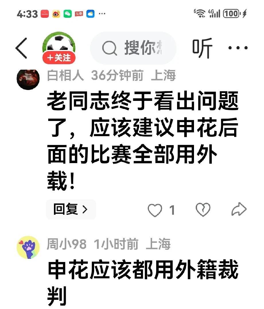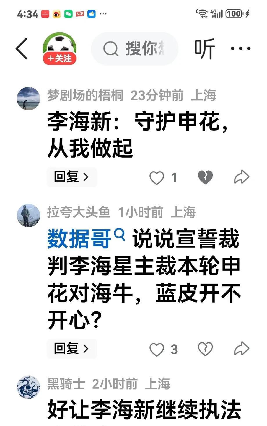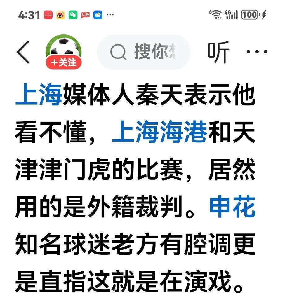 “老同志”笑过不惬意 秦天今晚“笑不动”,申花客场对阵青岛海牛的裁判是宣过誓的李海新,可算是如他所愿了,哈哈哈。 笑过之后,却又满腹怨言,因为得知明晚海港主场迎战天津津门虎的主裁判是约旦人,于是觉得难以理解,还有那个“有名”的球迷断言这是在“作秀”。 这么关系到夺冠大局的裁判安排,为什么不早点和中足联副理事长沟通一下:把这两个裁判对调一下呢。 且看这篇文章的跟帖,有点意思,细品还真挺有意思的。