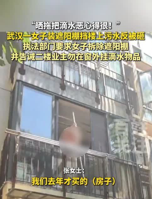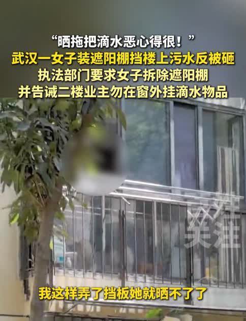 “太缺德了!”湖北武汉,女子住在一楼,为了图方便,就在后面开了扇门,不料,楼上老太太专门从门的位置晾拖把、笤帚、垃圾桶,把污水全部滴在女子门口。多次协商无果后,女子安装了遮阳棚,没想到老太太直接用棍子砸毁!网友:她在上面晾衣服的时候,你不会在底下烧泡沫嘛? 在武汉的一个小区里,张女士为了方便接送孩子,就在家后面多开了一扇门。可楼上的老太太不乐意了,说是太吵,然后就天天在张女士门口上方挂衣服、拖把、垃圾桶,脏水还一直往下滴,弄得张女士家里很烦心。 张女士找老太太聊过好几次,但都没啥用。没办法,她只好自己出钱搭了个遮阳棚。结果这遮阳棚才安上两天,就被老太太用长竿子给砸坏了。张女士报了警,警察来了也只是让她先把遮阳棚拆掉,对老太太的行为也没咋处理。物业来调解也是和稀泥,问题一直拖着没解决。 这一年来,张女士为了维权到处投诉,电话费都涨了不少,可就是没人能帮她解决问题。小区里这样的纠纷还不少,楼上楼下都不认识,矛盾越来越深。网友们也是议论纷纷,有的让张女士去起诉,有的让找社区帮忙,还有人开玩笑说:“她在上面晾,你就在下面烧泡沫呗。”虽然是句玩笑话,但也挺让人无奈的。现在,张女士还在想办法找法律援助。社区说他们会考虑弄个公共晒衣服的地方,但还得等阵子才能实现。那位老太太呢,还是老样子,不管不顾的,所以问题还是没解决,邻居之间的关系也越来越僵了。