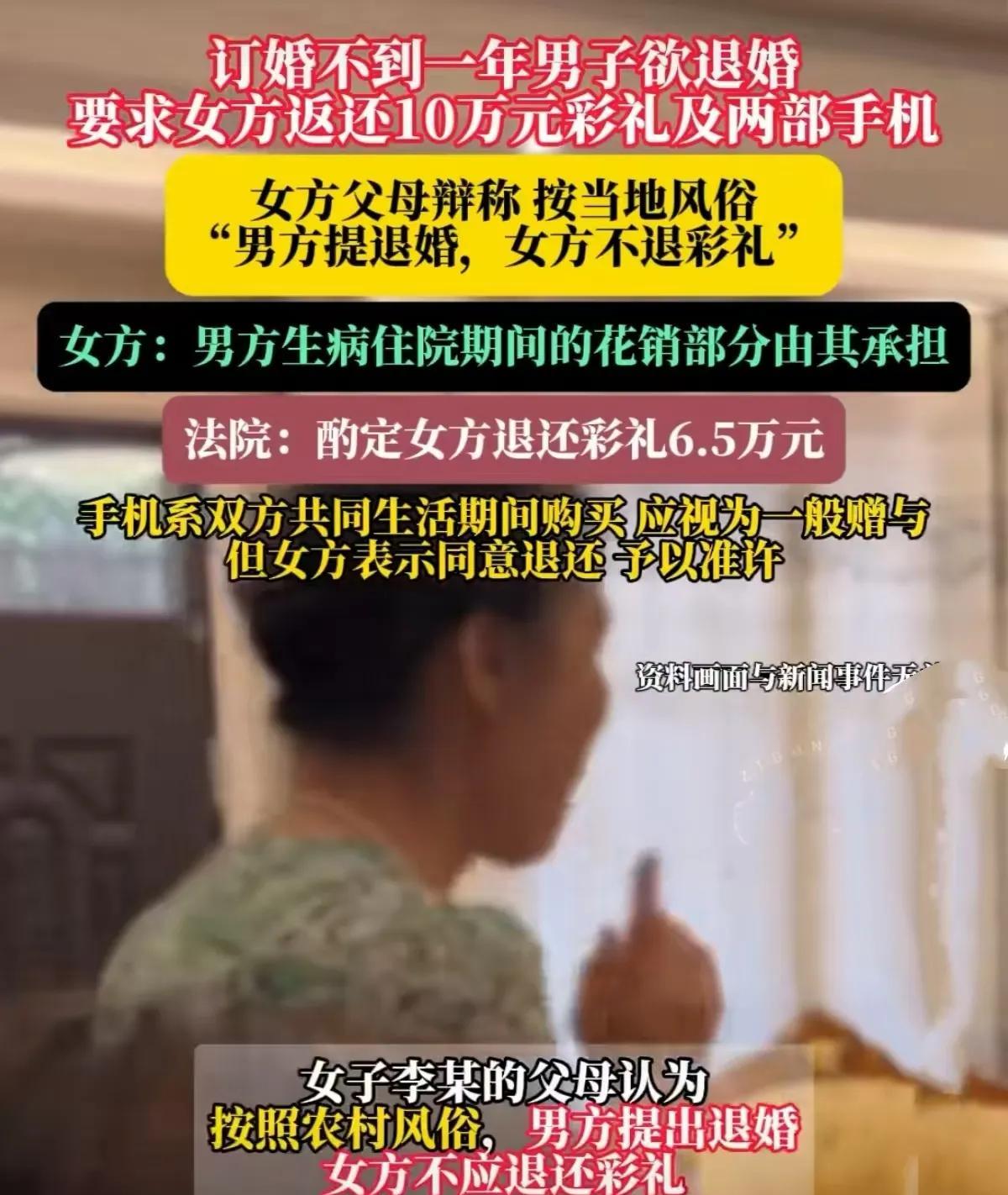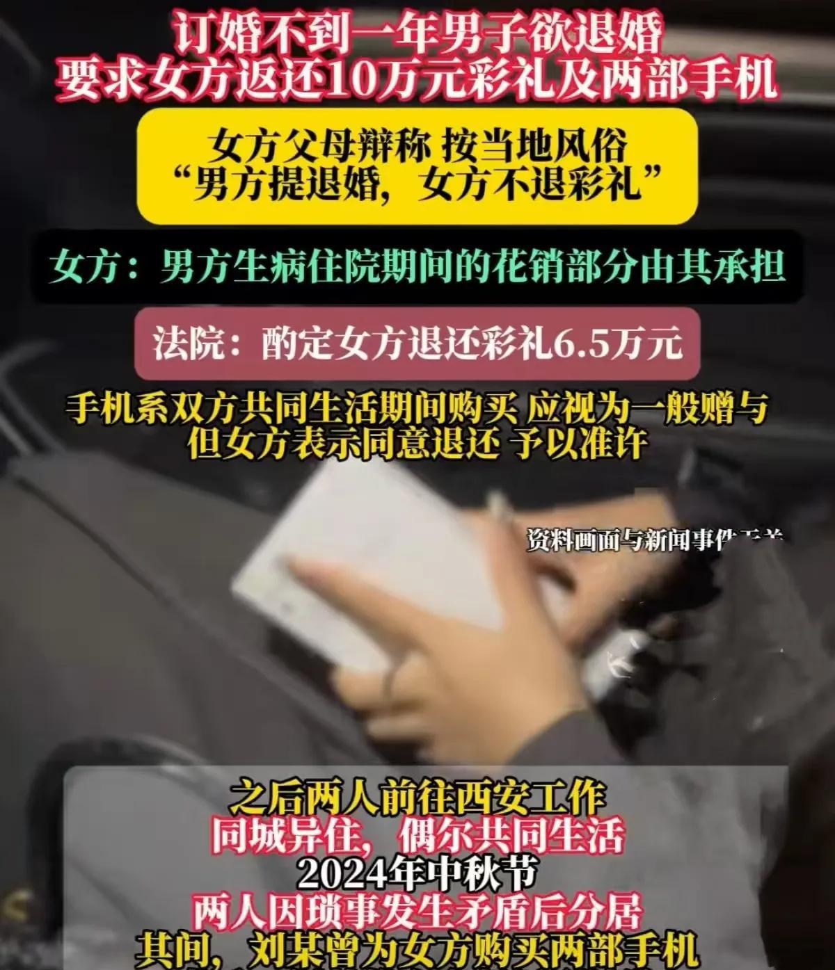 陕西渭南,男子订婚,按当地风俗给女方10万彩礼,女友就跟他住在了家里。同居2个月后,两人都出去打工,就没住在一起,只是偶尔相聚一下。而后两人矛盾越来越多,期间男子为哄女友还给她买了2部手机,可关系并未缓和,男子提出退婚,让女方退还10万彩礼和2部手机,女方父母:按当地农村风俗,男方提出退婚,女方不应退还彩礼!男子一气之下将女方诉至法庭,要求归还彩礼及手机,法院这样判的! 根据8月18日的报道,谁也没想到,小刘一家会因为订婚这件喜事被搅得鸡犬不宁! 小刘和小李经人介绍认识,处了没多长时间,感觉还不错,就在 2023 年 12 月底,按当地风俗举行了订婚仪式。订婚那天,小刘家里按照规矩,把 10 万元彩礼交到了小李手里,小李还从中拿了 2000 元给小刘,说是个心意。之后,小李就住进了小刘家,这一住就到了 2024 年 2 月底。 两人都觉得得出去打工挣钱,就一起去了西安。到了西安,他俩没住一块儿,成了同城异住的状态,也就偶尔能见上一面、聚一聚。 在西安打工的日子里,两人之间的矛盾开始慢慢冒头。一开始只是些鸡毛蒜皮的小事,你嫌我下班回来不帮忙收拾,我嫌你花钱没个计划。可矛盾这东西,就跟滚雪球似的,越积越多,越闹越大。小刘看着两人关系越来越僵,心里也挺着急,想着哄哄小李,说不定能缓和缓和。 于是,他特意给小李买了两部手机,想着能让她开心点。可没想到,这两部手机送出去,关系还是没什么好转,两人该吵还是吵。 后来,到了 2024 年中秋节,因为一件琐事,两人又大吵了一架,之后就彻底分居了。小刘心里凉透了,觉得这婚也没必要结下去了,就提出了退婚,还要求小李退还当初给的 10 万元彩礼,以及那两部他买的手机。 小李的父母知道后,特别生气,对着小刘就喊:“哪有男方提退婚还退彩礼的!” 他们觉得,按照当地农村的风俗,男方先提出退婚,女方是不用退还彩礼的。 小刘一看协商不成,一气之下就把小李告上了法庭,非要让她把彩礼和手机都还回来不可。 法院开始审理时考虑到,虽然按照当地风俗,男方提退婚女方可能不退彩礼,但小刘和小李订婚后,小李在小刘家生活过一段时间,而且后来小刘生病住院,小李也承担了部分花销。综合这些情况,法院最终酌定小李退还小刘 6.5 万元彩礼。 至于那两部手机,法院认为,这是两人在共同生活期间小刘买给小李的,应该算是一般的赠与。不过,小李后来表示同意退还,法院也就准许了。 婚姻大事,真的得慎重。不管是订婚还是结婚,双方都得有足够的了解,不能因为一时的好感就匆忙决定。而且,涉及到钱财方面,也得提前把话说清楚,免得最后闹得不愉快,甚至对簿公堂。 对于这件事情,你们怎么看?