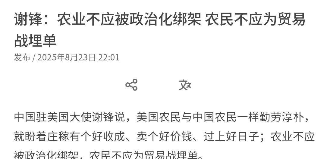我们对美国喊话了!就看美国接不接球!在美国的大豆种植户对特朗普施压,要求特朗普尽快谈妥中美经贸协议之后,我们的驻美大使谢锋出来对美国喊话了。谢锋大使表示,美国农民与中国农民一样勤劳淳朴,就盼着庄稼有个好收成、卖个好价钱、过上好日子;农业不应被政治化绑架,农民不应为贸易战埋单。 谢锋大使称,今年上半年,美对华农产品出口额同比下降53%,其中大豆下降51%。大豆也印证中美合则两利、斗则俱伤的金科玉律,保护主义甚嚣尘上使中美农业合作阴云笼罩。很显然,美国种植户刚对特朗普施压,我们大使借此机会对美国喊话。我们这样做,无疑就是给美国做球,希望美国政府抓住机会,妥善处理与我们之间的分歧。我们这当然是给美国台阶下。 事实上,美国是全球最大的农业出口国,我们是全球最大的农产品进口国 ,而大豆进口量占我们全部粮食进口量的六成以上。现在中美农业贸易大幅衰减,原因当然是出在美国身上。我们对美国喊话,这当然是告诉美国,面对现在的僵局,让我们单方面让步不可能,中美务实的做法就是各让一步。否则,美国的种植户可能也只得眼睁睁的看着农作物烂在地里!